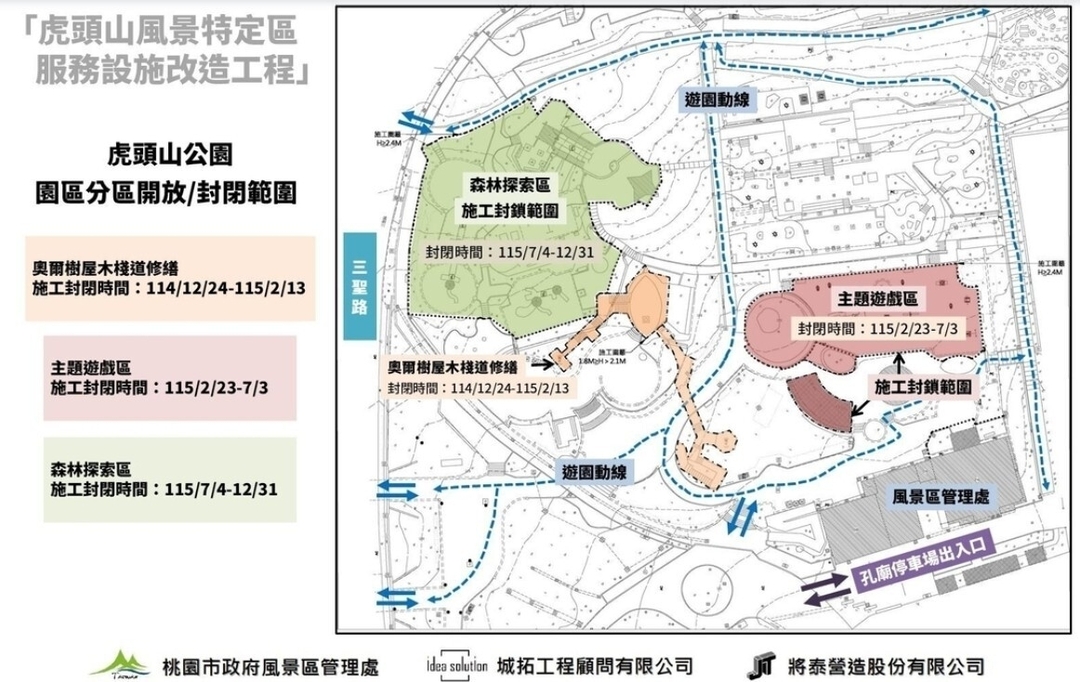 工程於114年11月5日正式開工,考量虎頭山公園遊客眾多,為降低施工期間對遊客及民眾使用之影響,工程將採「分區施工、分期開放」方式辦理,預計115年12月31日全區完工,工期約420日曆天。