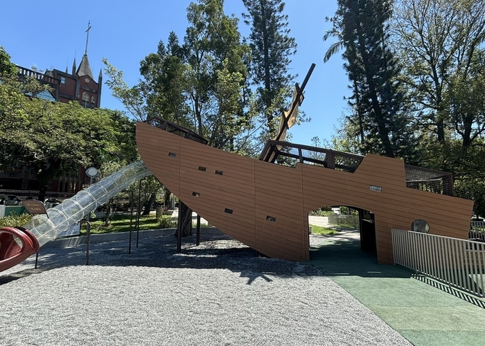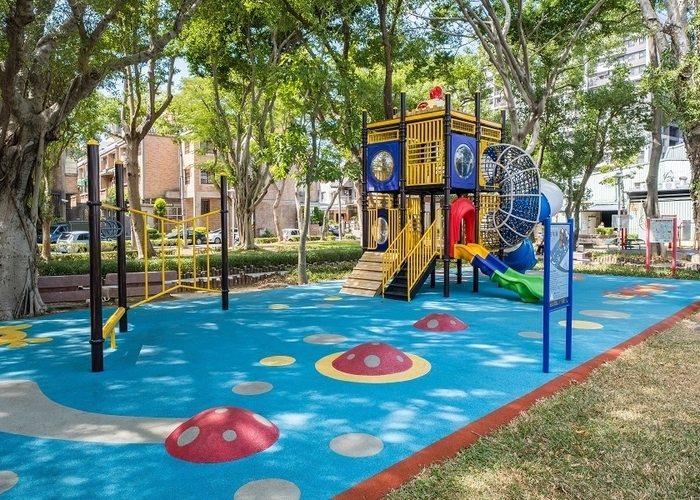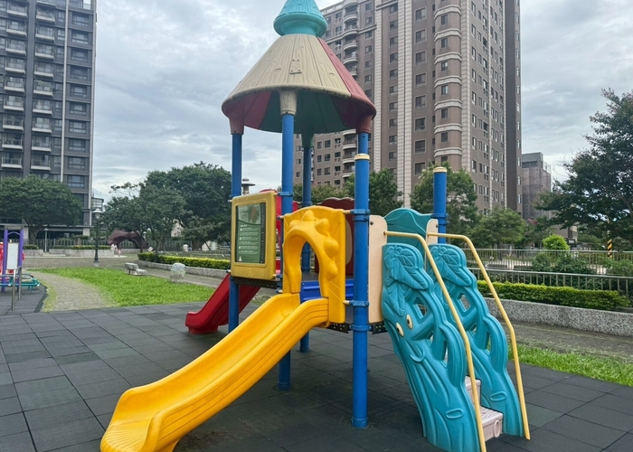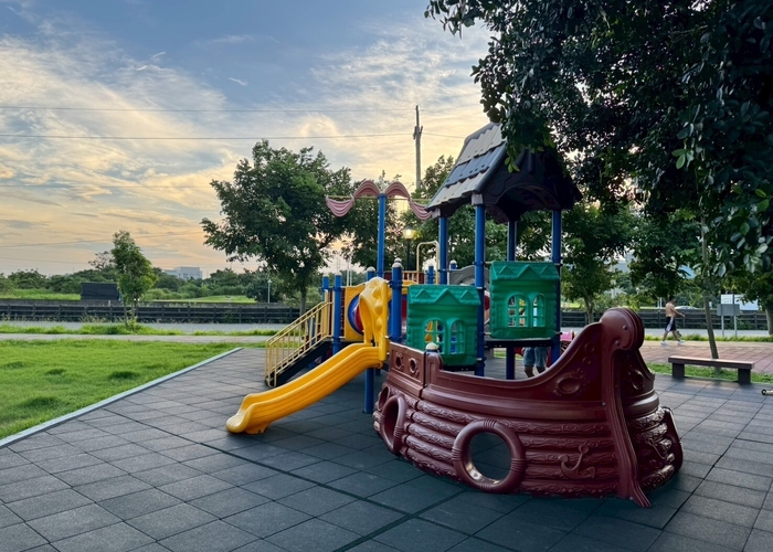 海洋風的兒童遊戲場,其中3米高的彩繪造型山丘在遊戲場內格外顯眼,魚兒身旁游還有彩色海龜作伴,彷彿置身海底世界!坐上溜滑梯滑入白沙坑,迷你挖土機、玩沙平台,滿足孩子的玩心。公園內除了設有常見的鞦韆,還有一組可360度旋轉的鞦韆,能讓孩子即刻變身小飛俠,享受乘風之樂。