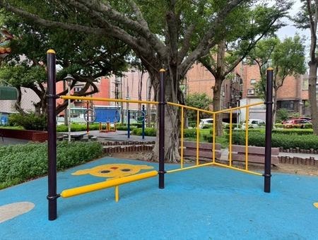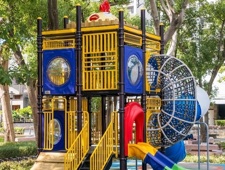 遊戲場以活潑可愛的黃色小雞為核心意象,打造出一座造型鮮明的雙層遊戲塔,充分激發孩子的好奇心與探索慾。組合遊具也結合滑梯、攀爬網、觀景平台等多項設施,營造富有趣味與冒險感的遊戲空間,吸引孩童探索與互動。