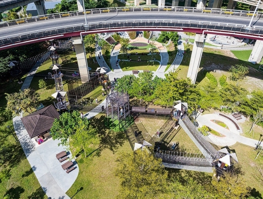 遊戲場佔地約 0.72 公頃,以「陸地與空中探索」為核心概念,規劃出多元且刺激的遊樂設施。從地面的攀爬、穿越與平衡挑戰,到引人入勝的高空滑索與立體繩網等高架設施,讓孩子們化身為小小冒險家,在安全環境中盡情探索身體潛能。場域中設有「綜合挑戰區」、「兒童遊戲區」與「滑索區」等三大挑戰分區,確保從 2 歲到 13 歲以上的各年齡層兒童及青少年,都能找到最適合自己的玩耍方式。