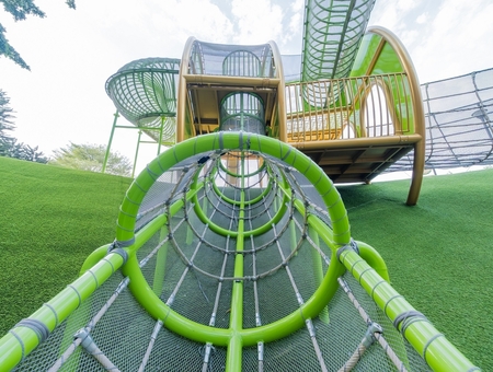 - 草坡探險區: 利用自然地形的高低差,設置了色彩繽紛的水管隧道與極富速度感的磨石子溜滑梯。
