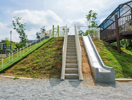 設施安全與維護:部分遊具如磨石子滑梯與攀爬網設計具挑戰性,使用前請確認孩子適合;若攜帶小石頭等異物上滑梯,可能增加滑行危險
