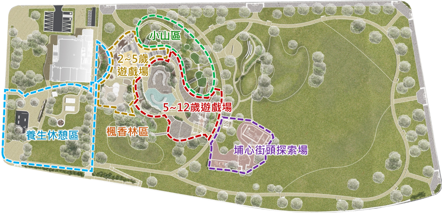 全區採分齡分區規劃,主要分成銀髮樂活區、2~5歲遊戲區、5~12歲遊戲區及適宜13歲以上的活動區域。銀髮樂活區汰換原老舊設施、拆除原有組合式遊具,更新體健設施、地坪、座椅及植栽等,維持社交空間機能,整合為適合全齡使用的休憩廣場。2~5歲和5~12歲遊戲區則擷取眷村冒險、挑戰、勇敢精神,復刻楊梅區四維國小兩條龍精神地標,打造新的覆網爬籠遊戲區。13歲以上活動區域利用紅磚元素還原當時眷村空間分佈情形,提供追憶舊眷村樣貌的空間,也讓孩童在追逐、玩樂中,逐步認識自己家鄉的空間紋理。整座公園特別保留既有楓香林,以步道串聯自然遊戲場,提供孩童在林蔭空間穿梭,搭配園圃誘花誘鳥、賞花賞果植栽,讓孩子能與大自然為友。