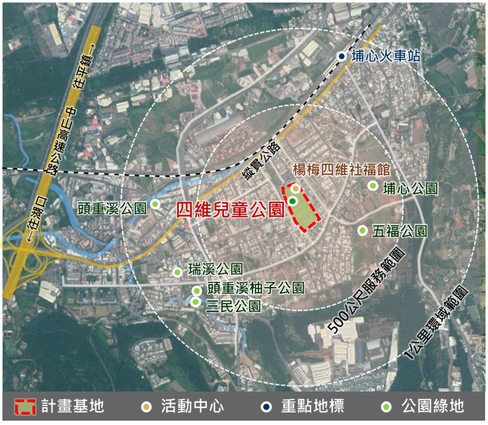 四維兒童公園位於楊梅區四維二路及永美路445巷旁,基地範圍包含既有四維兒童公園,以及南側楊梅區公所代管之國有土地,其前身為埔心營區,總面積約3.1公頃,周圍以住宅區為主,周邊學校包含四維國小、瑞塘國小、瑞埔國小、瑞坪國中、治平高中等,且鄰近埔心車站、縱貫公路、國道一號楊梅交流道,交通便利。