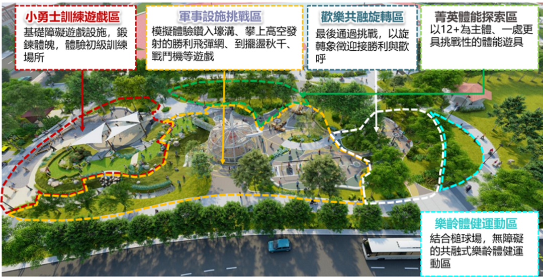 本工程擇定軍事設施區7,458平方公尺作為特色遊戲場範圍,延續「軍事場景記憶」以及龍潭「台地丘陵地景」融入遊戲場,利用場域情境互動、建構想像力,及分齡遊戲挑戰差異,讓孩子模擬通過一段歷練後轉變成小勇士的體驗,使兒童透過遊戲場域增強社會、情感、動作及創新發展達到親子共融成長。依不同年齡層使用需求,分區規劃遊戲設施包含小勇士訓練遊戲區、軍事設施挑戰區、歡樂共融旋轉區、菁英體能探索區及樂齡體健運動區,由北到南分區分齡規劃適用年齡逐步提升。