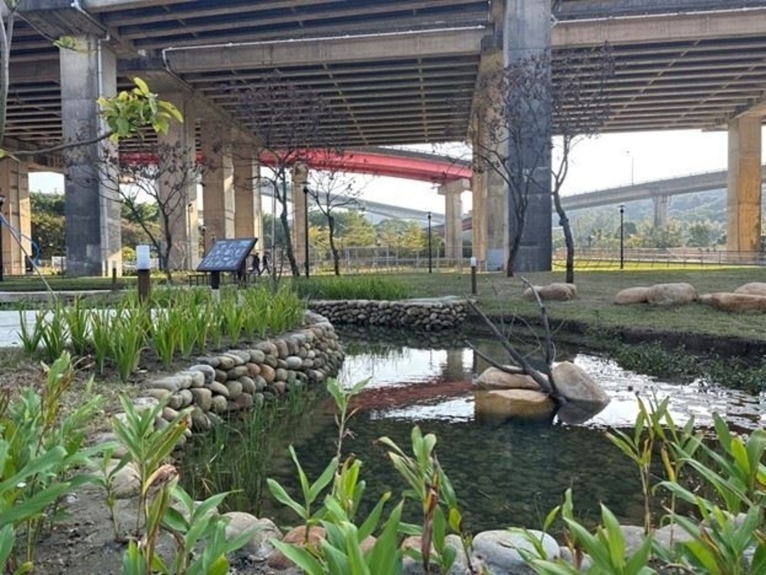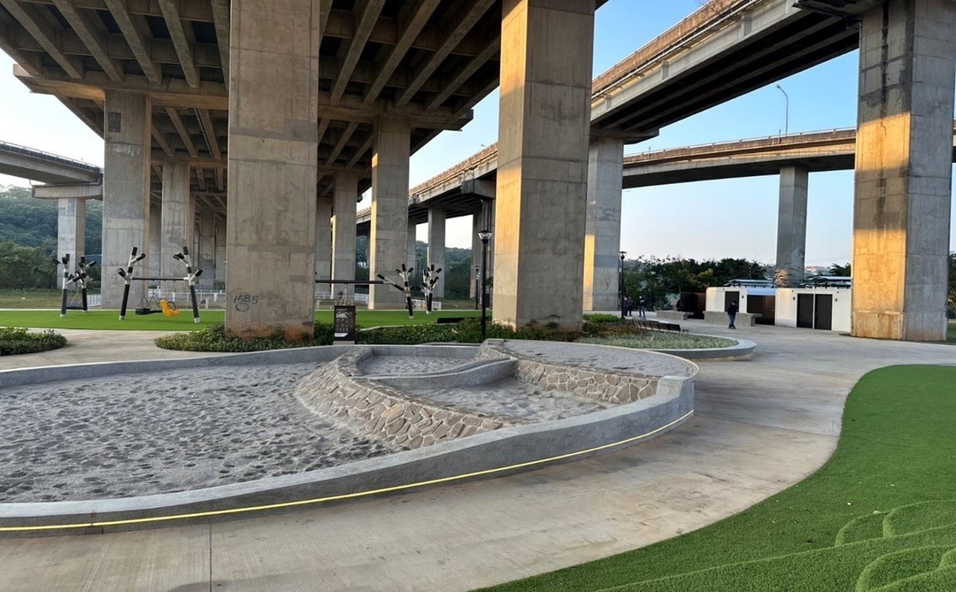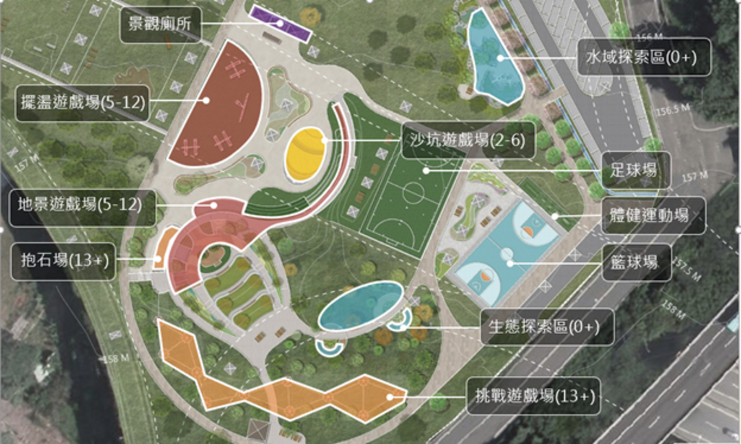桃市府為建置符合民眾需求之特色遊戲場域,落實兒童表意權,並整合新舊公園介面,於規劃設計中辦理2場兒童參與式工作坊、1次地方說明會,也提報市府公園適性發展審議會,邀集各領域專家學者,社會團體、各局處及區公所代表等共同審議。工作坊以「環境探索」與「創意發揮」為目的,透過活動引導,鼓勵孩童說出對於遊戲的想法與意見,藉此打開「兒童表意」的示範意義,在活動的過程中,可以看出孩子們對自然環境中的樹枝、落葉、果實都充滿好奇,也對具挑戰性的設施躍躍欲試,喜歡帶給自已感官刺激的體能活動。本工程遊戲場範圍約6,300平方公尺,滿足不同年齡、不同能力兒童遊戲需求,遊戲場內容包括:(2-12歲)沙坑遊戲場、(5-12歲)擺盪遊戲場、(5-12歲)地形遊戲場、(13歲以上)挑戰遊戲場及全齡皆可使用的自然探索遊戲場。遊戲設施包含沙坑、鞦韆、遊戲草坡、滑梯、攀爬設施、攀爬牆、抱石場、多功能挑戰路徑、戲水設施及自然探索遊戲設施等。