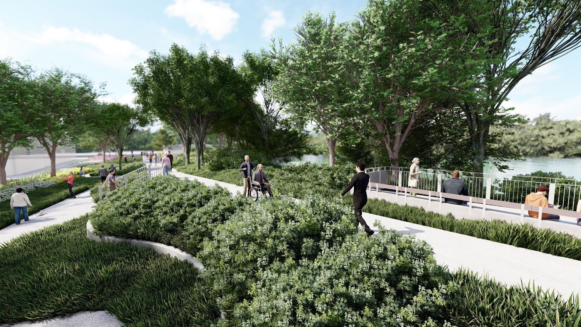 空間設計方面,北側入口廣場預留YouBike設站空間,便利民眾綠色出行;林蔭廣場提供舒適聚會與休憩場所;療癒香氛步道透過特色植栽設計,營造鳥語花香、五感體驗的自然氛圍;湖畔林蔭步道則設有1:20緩坡道,提升通行無礙性;而眺景平台則設於堤頂,可遠眺埤塘全景,搭配座椅與遮蔭,營造絕佳賞景與放鬆空間。