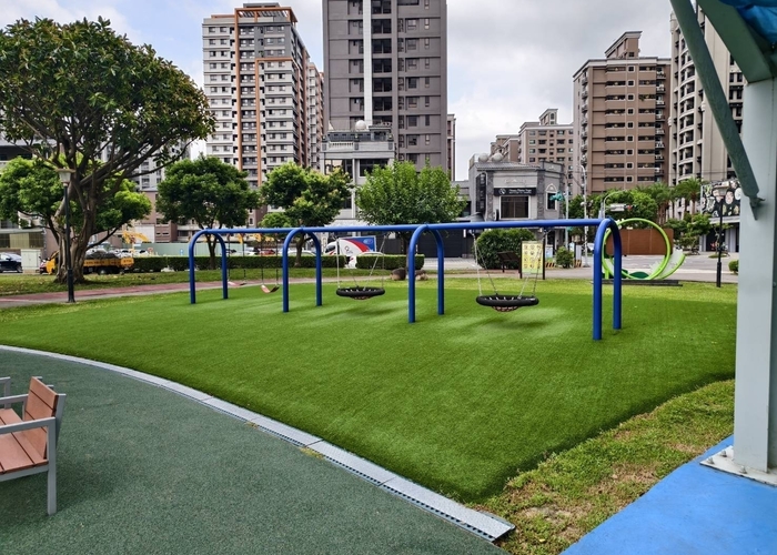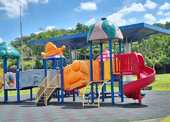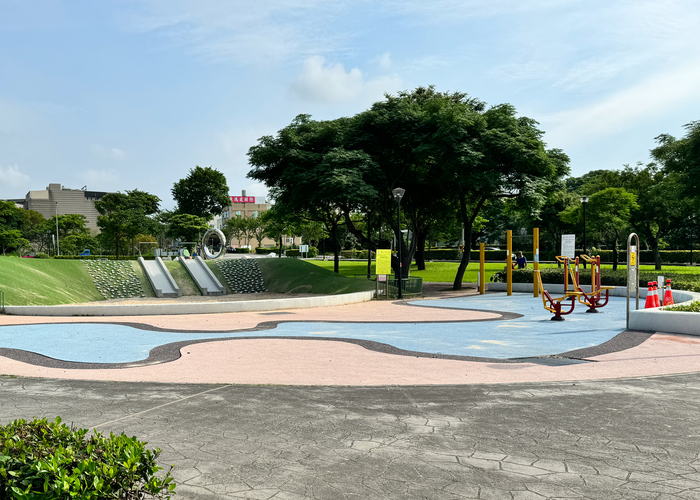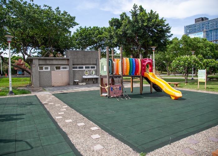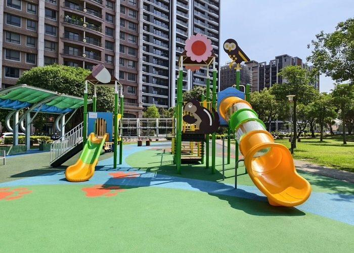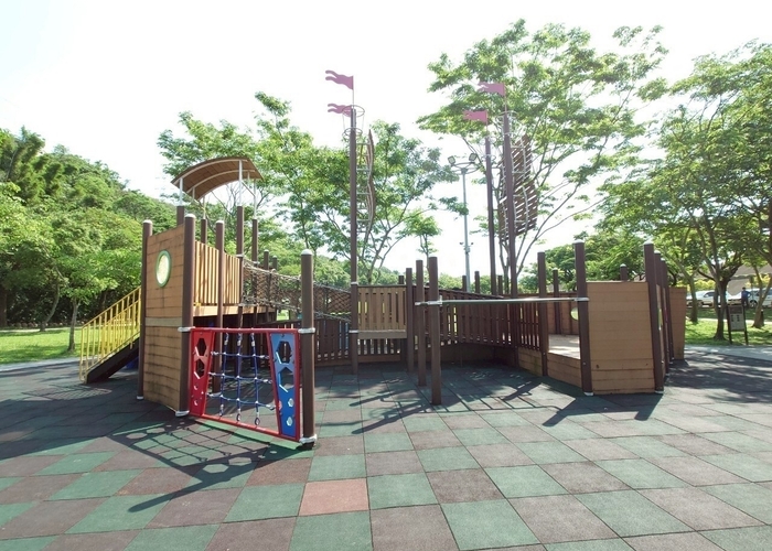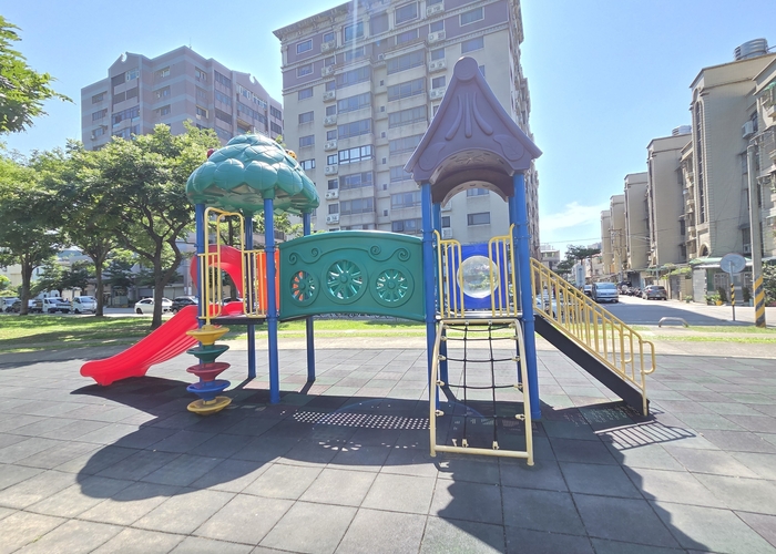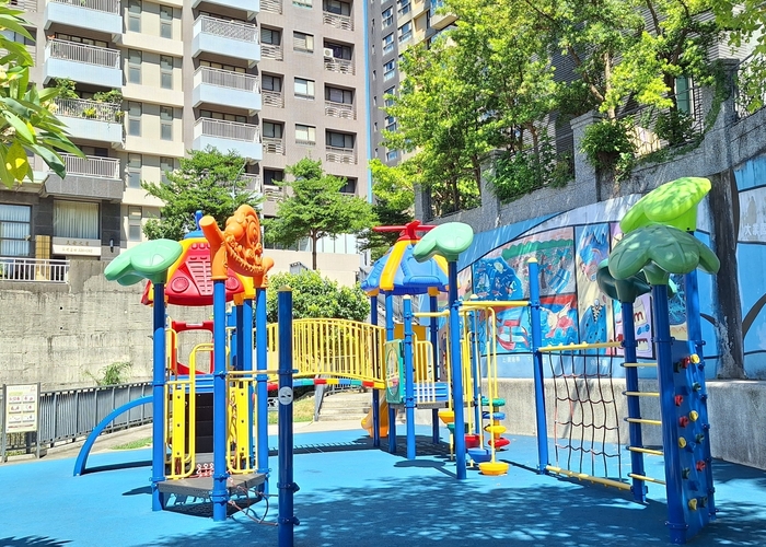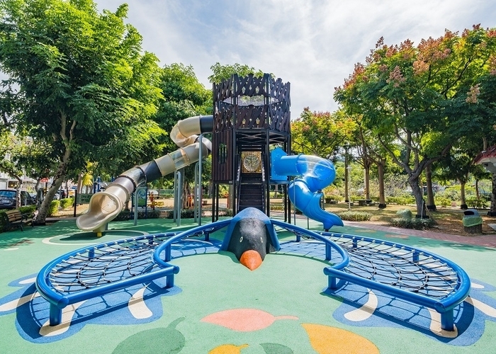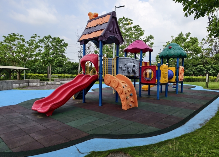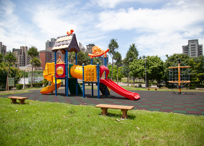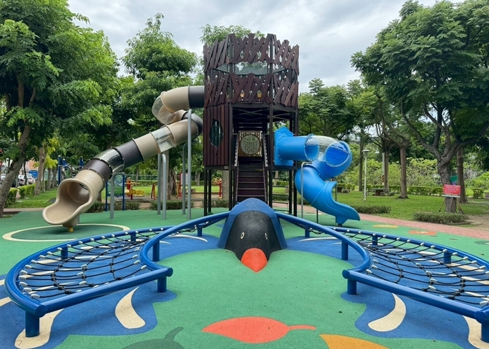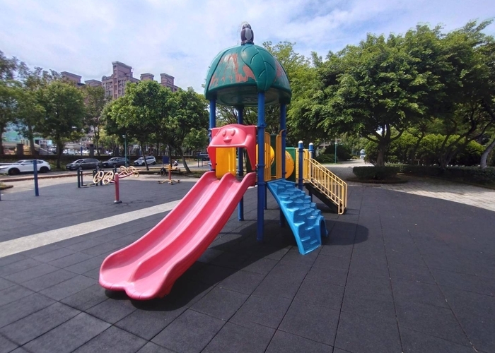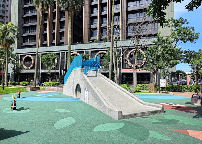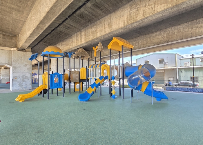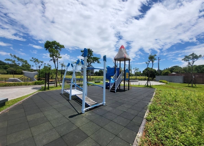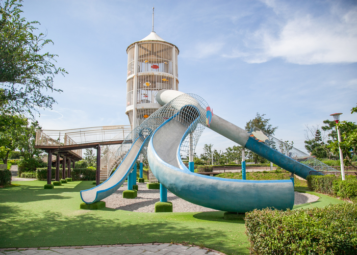 海洋風的兒童遊戲場,其中3米高的彩繪造型山丘在遊戲場內格外顯眼,魚兒身旁游還有彩色海龜作伴,彷彿置身海底世界!坐上溜滑梯滑入白沙坑,迷你挖土機、玩沙平台,滿足孩子的玩心。公園內除了設有常見的鞦韆,還有一組可360度旋轉的鞦韆,能讓孩子即刻變身小飛俠,享受乘風之樂。