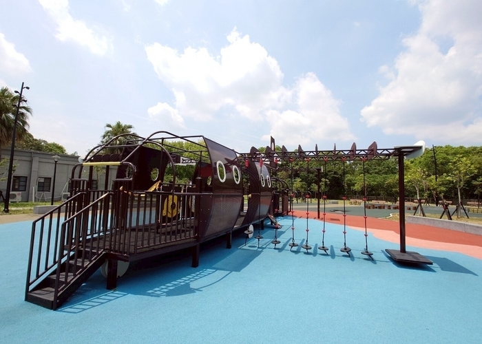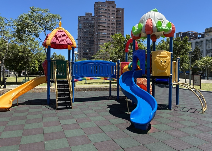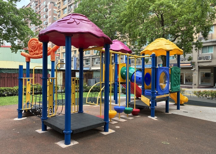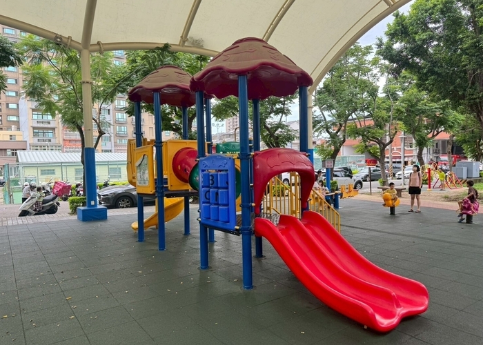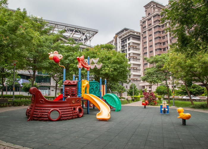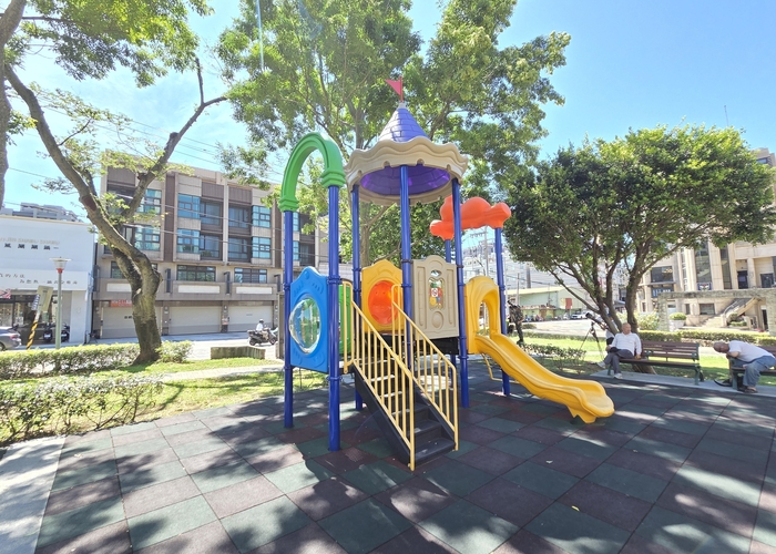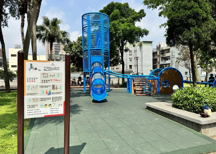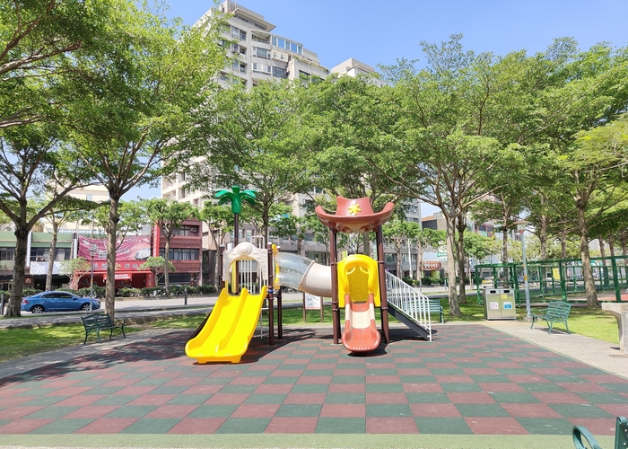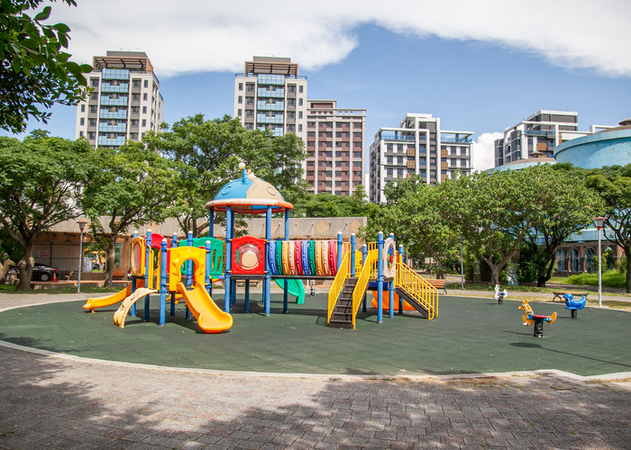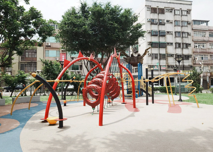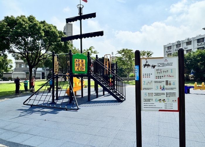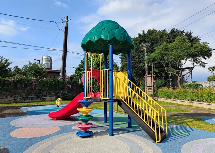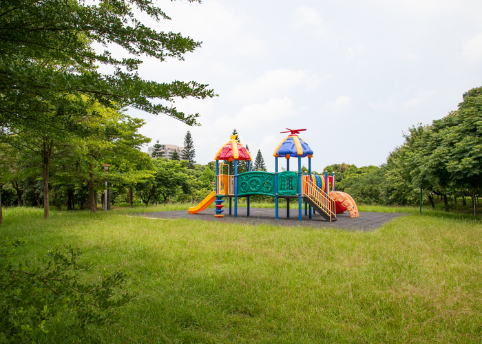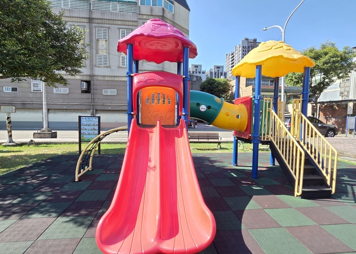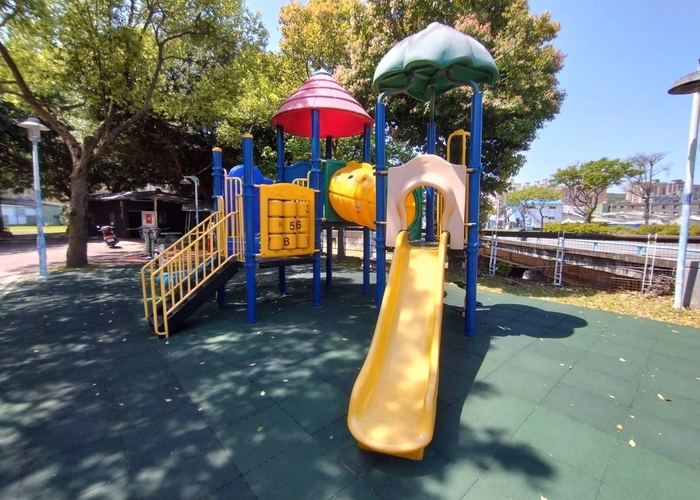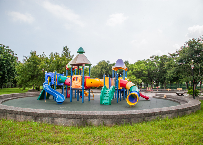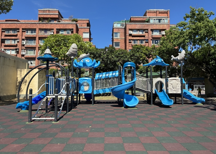 海洋風的兒童遊戲場,其中3米高的彩繪造型山丘在遊戲場內格外顯眼,魚兒身旁游還有彩色海龜作伴,彷彿置身海底世界!坐上溜滑梯滑入白沙坑,迷你挖土機、玩沙平台,滿足孩子的玩心。公園內除了設有常見的鞦韆,還有一組可360度旋轉的鞦韆,能讓孩子即刻變身小飛俠,享受乘風之樂。