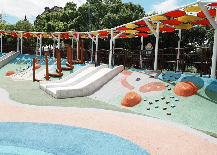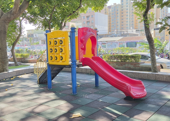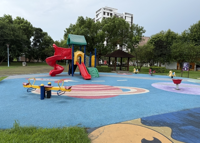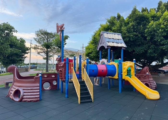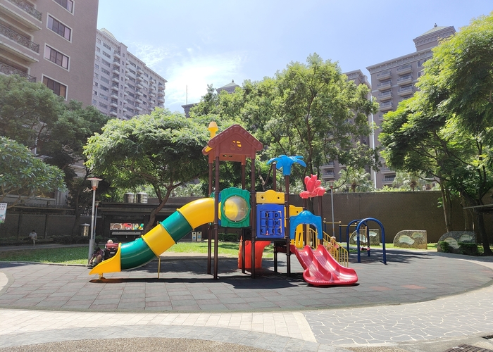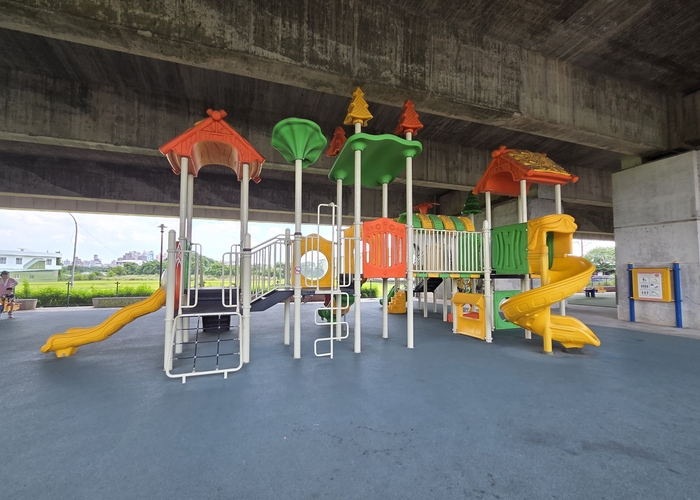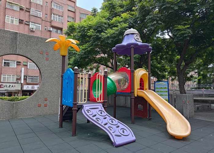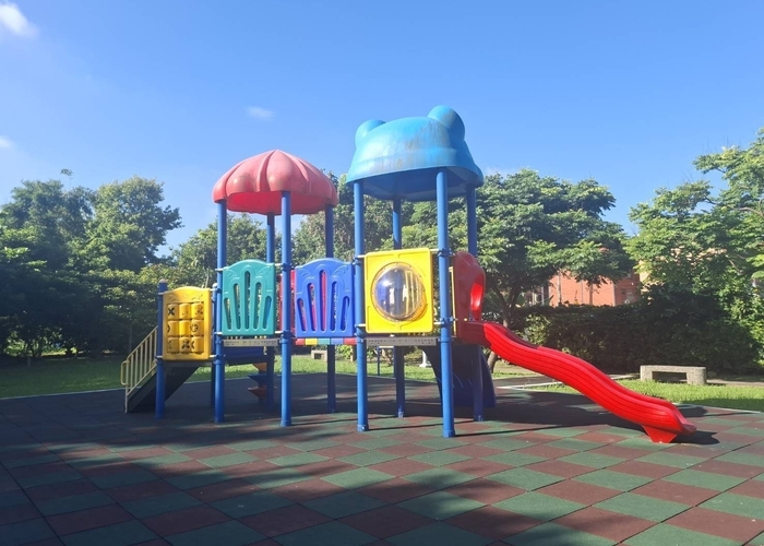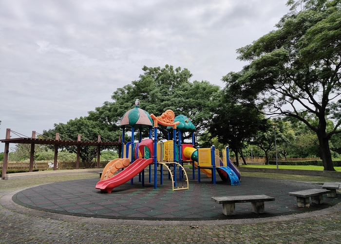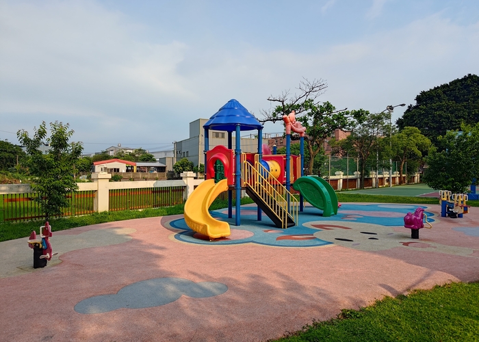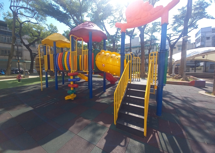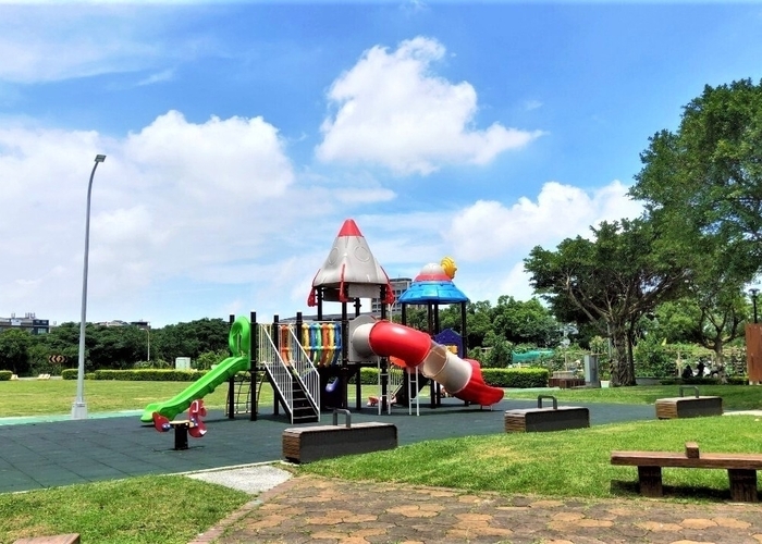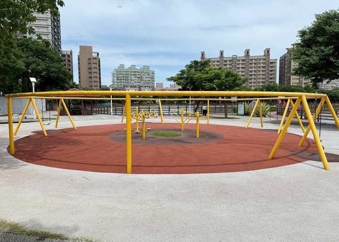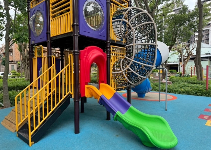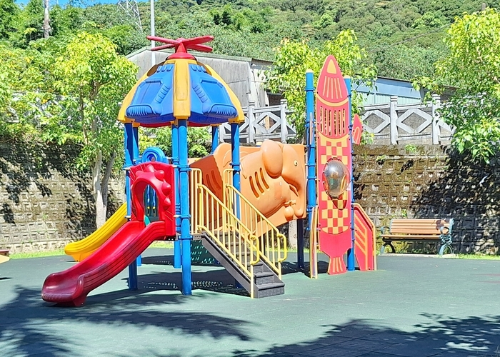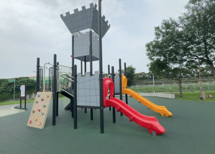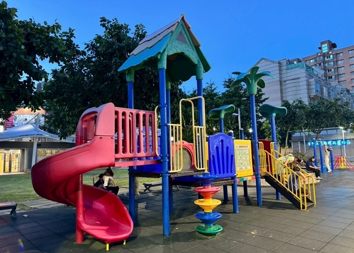海洋風的兒童遊戲場,其中3米高的彩繪造型山丘在遊戲場內格外顯眼,魚兒身旁游還有彩色海龜作伴,彷彿置身海底世界!坐上溜滑梯滑入白沙坑,迷你挖土機、玩沙平台,滿足孩子的玩心。公園內除了設有常見的鞦韆,還有一組可360度旋轉的鞦韆,能讓孩子即刻變身小飛俠,享受乘風之樂。