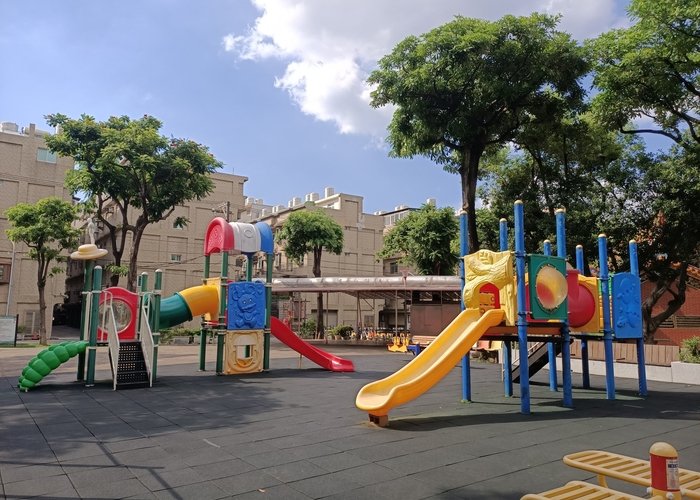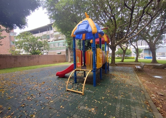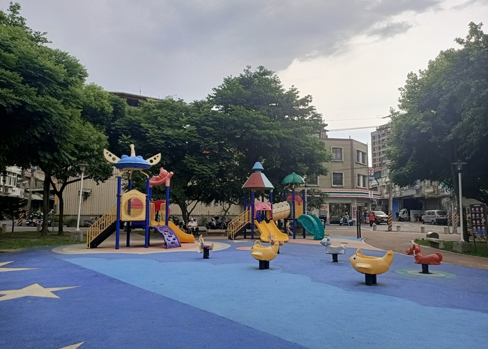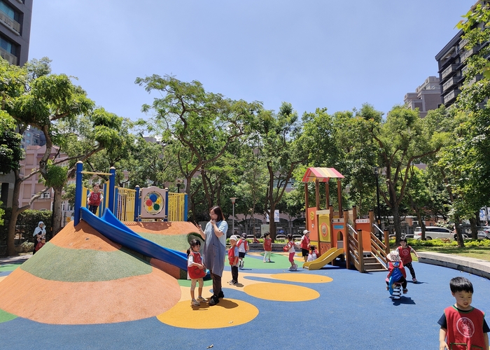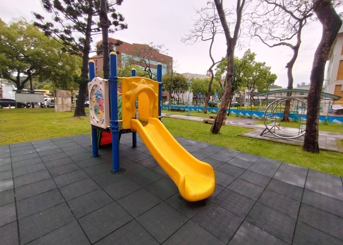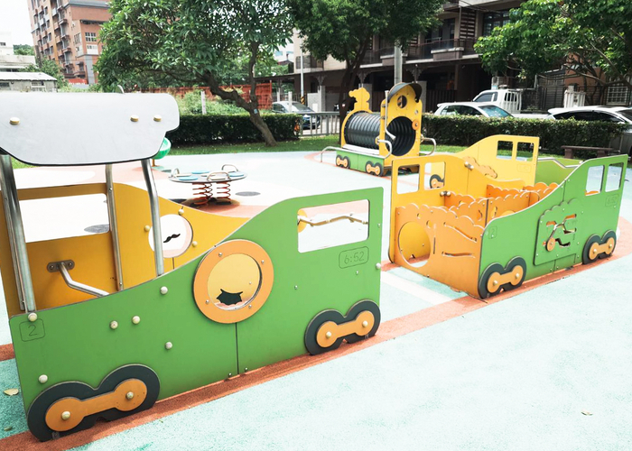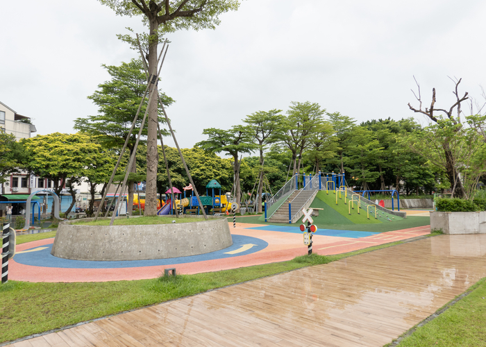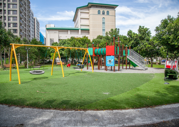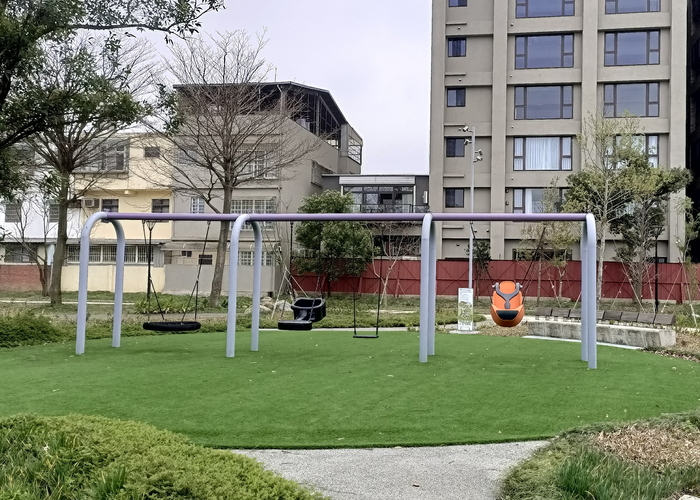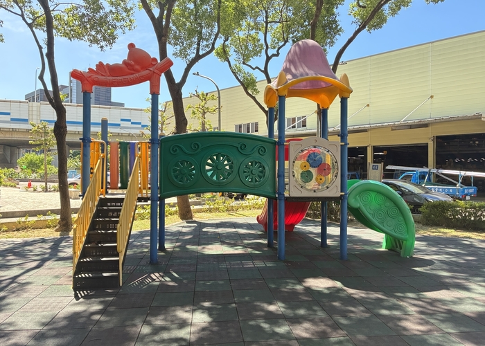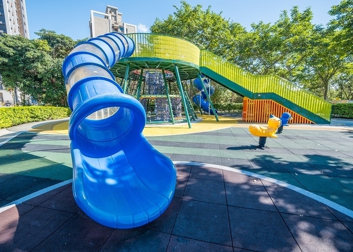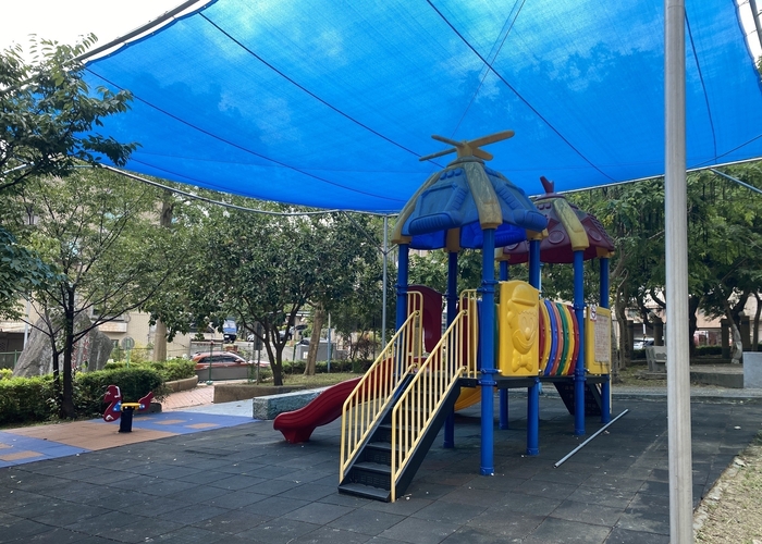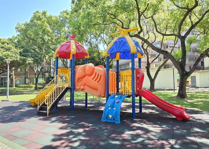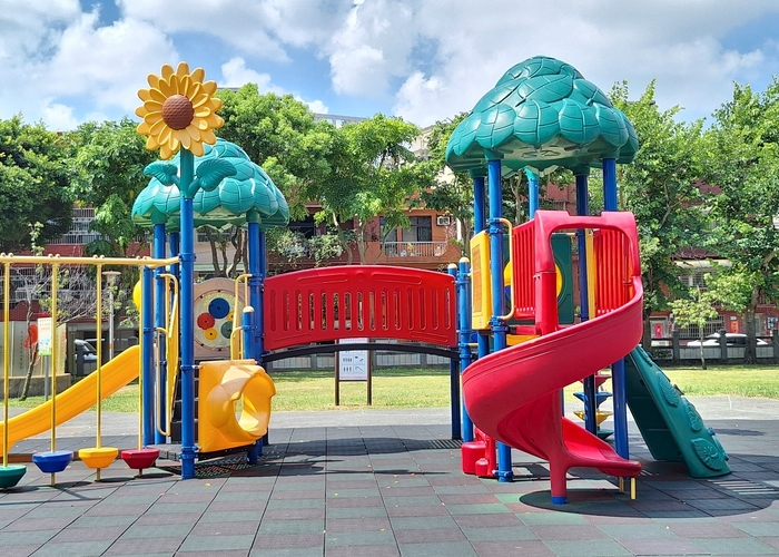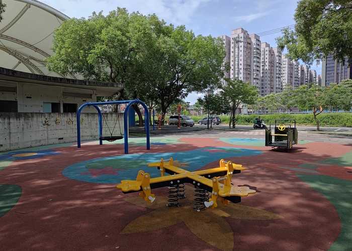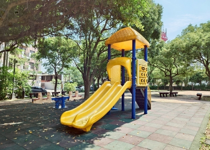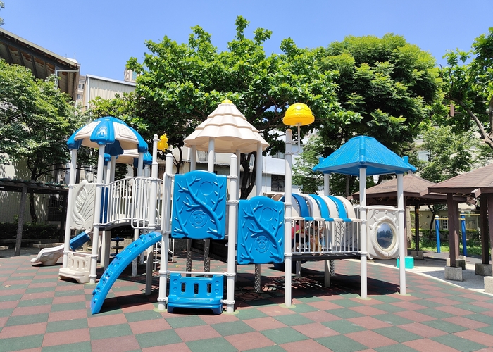 海洋風的兒童遊戲場,其中3米高的彩繪造型山丘在遊戲場內格外顯眼,魚兒身旁游還有彩色海龜作伴,彷彿置身海底世界!坐上溜滑梯滑入白沙坑,迷你挖土機、玩沙平台,滿足孩子的玩心。公園內除了設有常見的鞦韆,還有一組可360度旋轉的鞦韆,能讓孩子即刻變身小飛俠,享受乘風之樂。