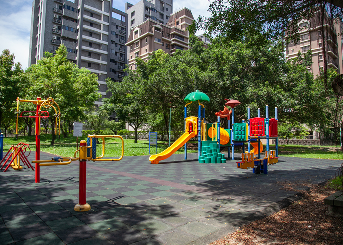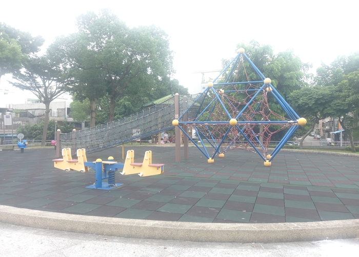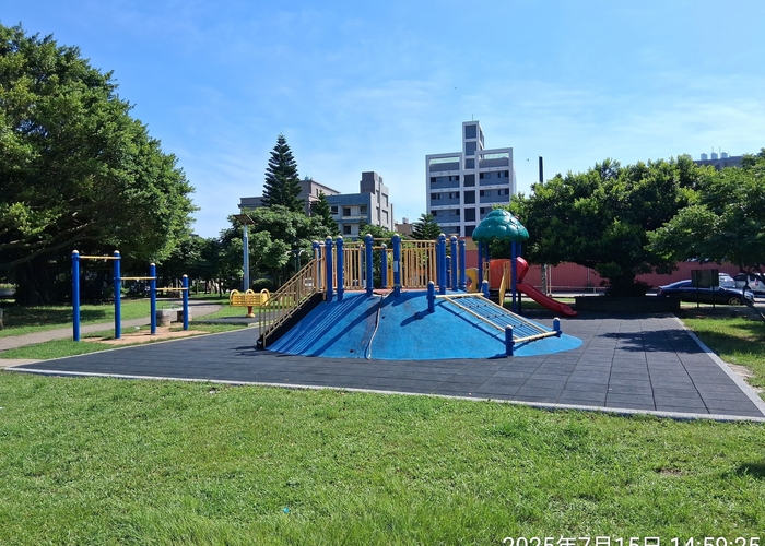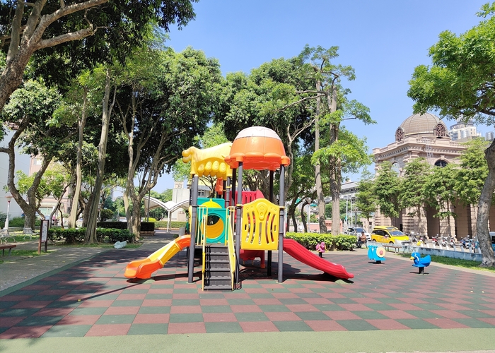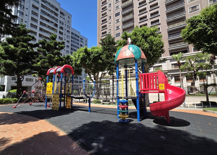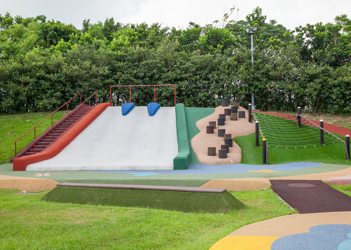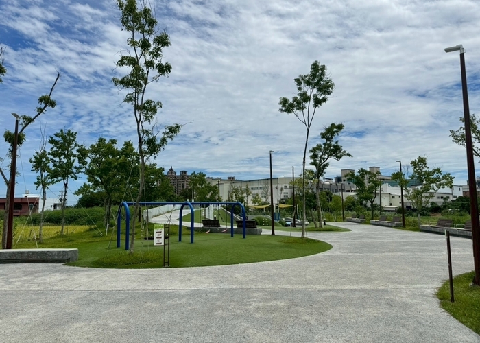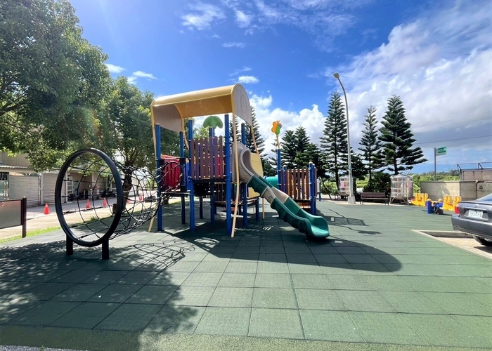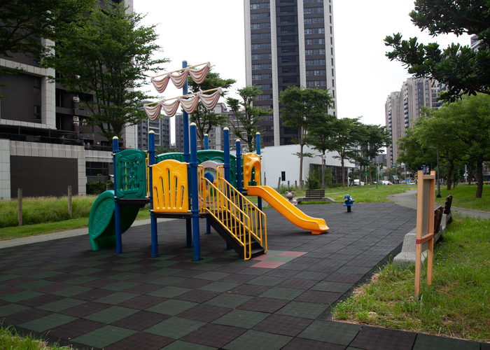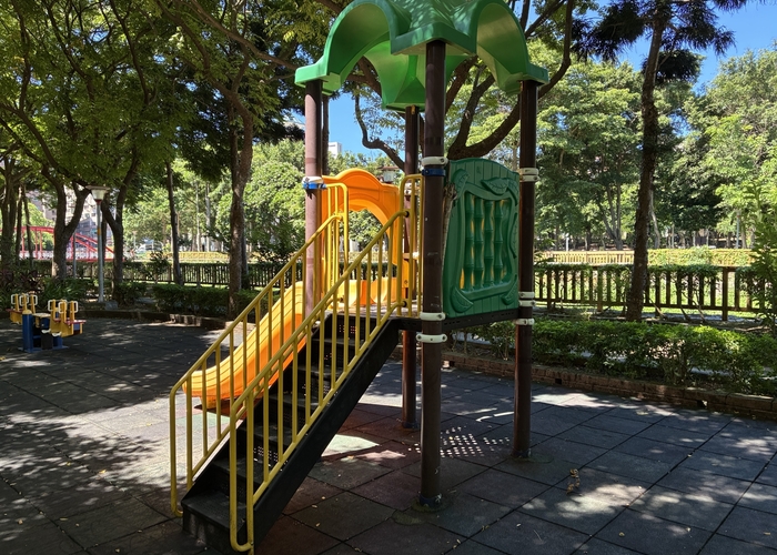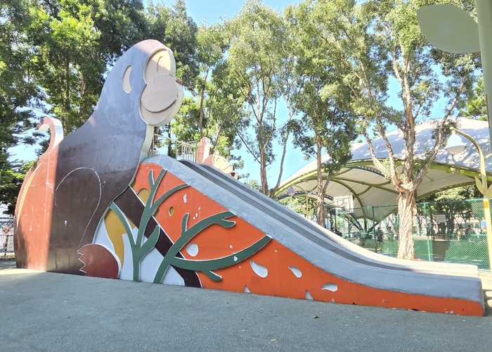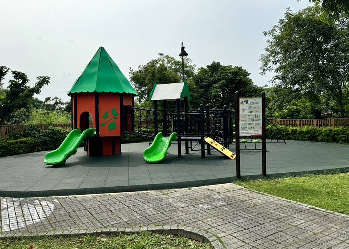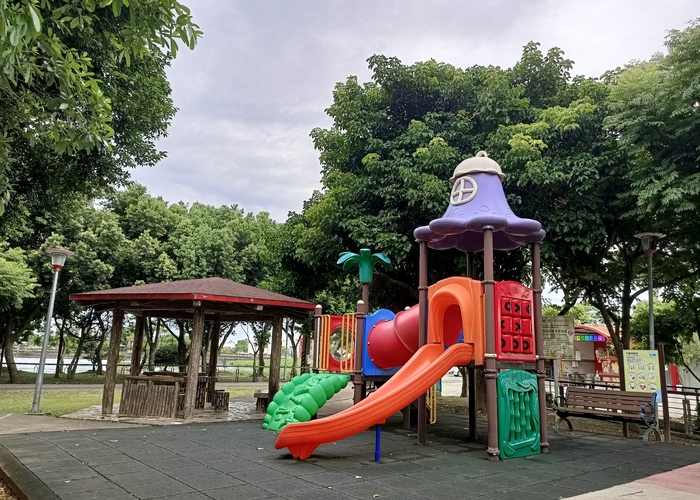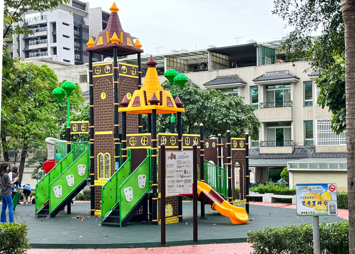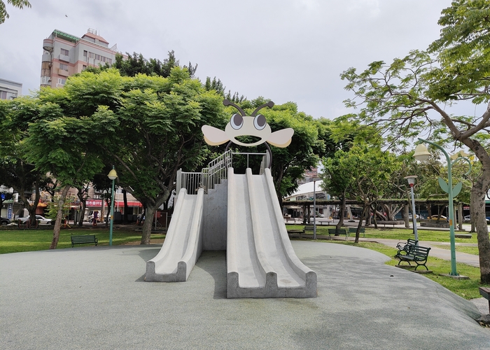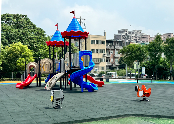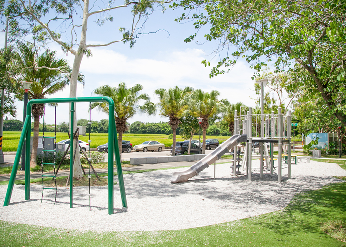 海洋風的兒童遊戲場,其中3米高的彩繪造型山丘在遊戲場內格外顯眼,魚兒身旁游還有彩色海龜作伴,彷彿置身海底世界!坐上溜滑梯滑入白沙坑,迷你挖土機、玩沙平台,滿足孩子的玩心。公園內除了設有常見的鞦韆,還有一組可360度旋轉的鞦韆,能讓孩子即刻變身小飛俠,享受乘風之樂。
