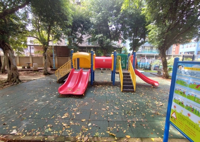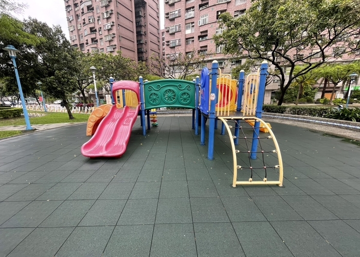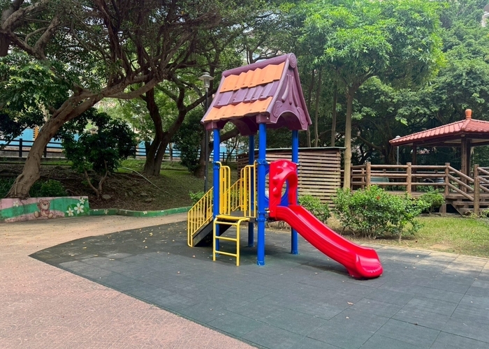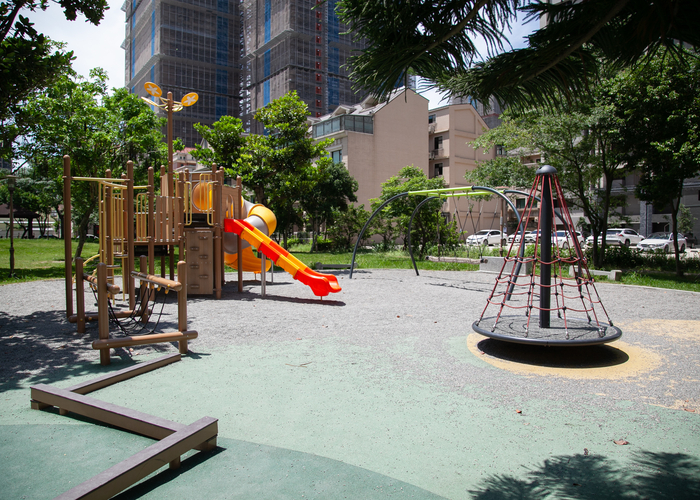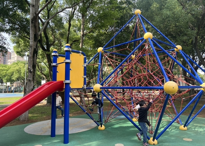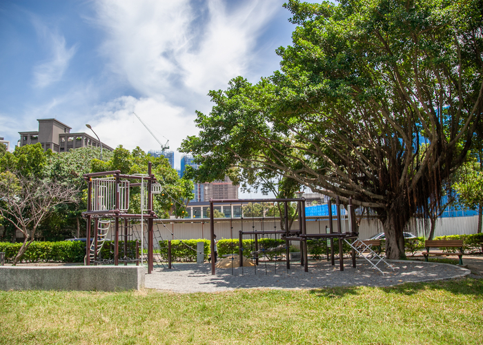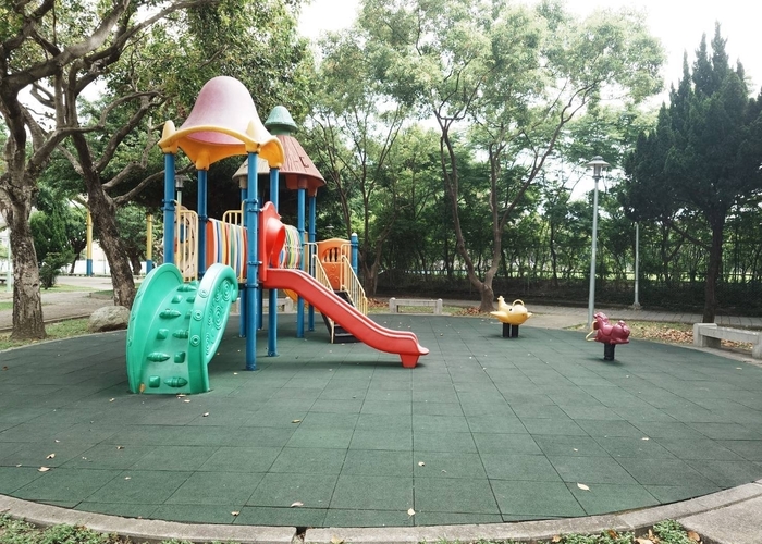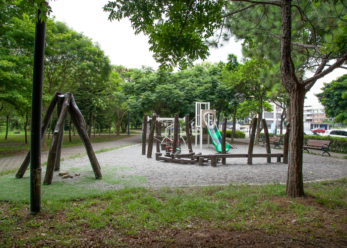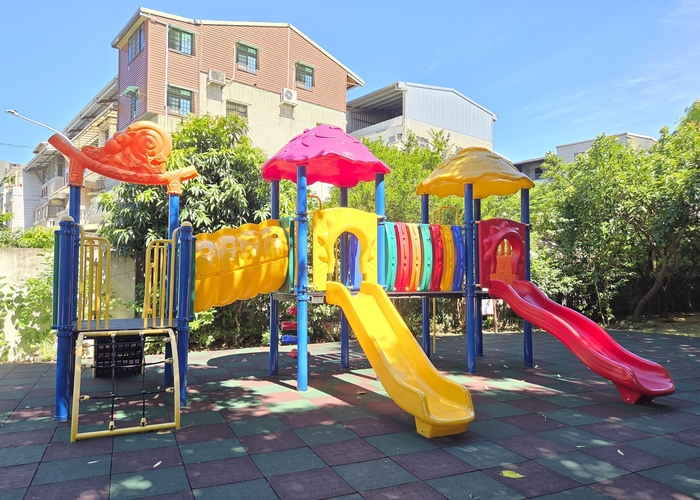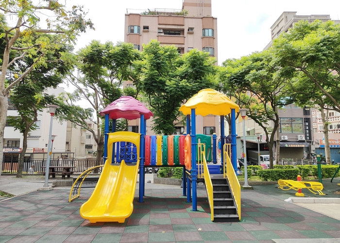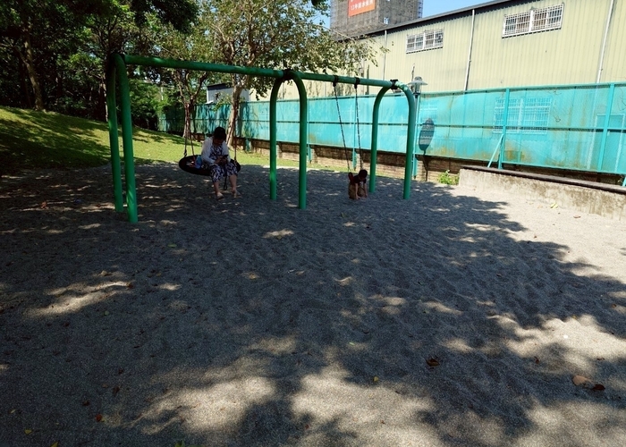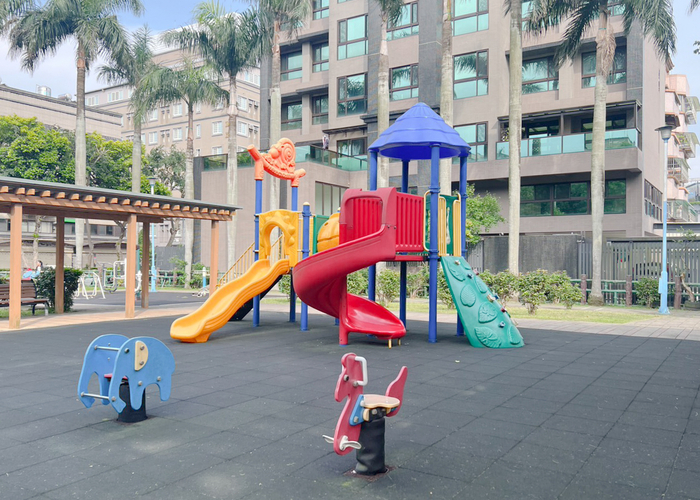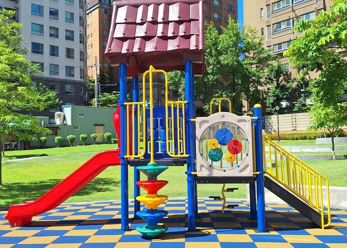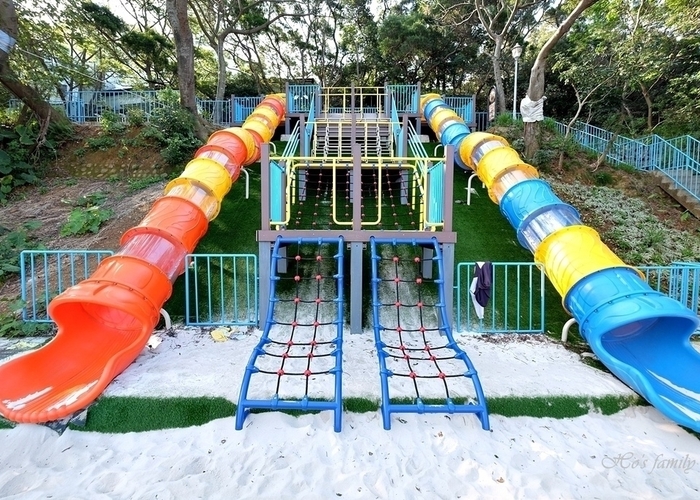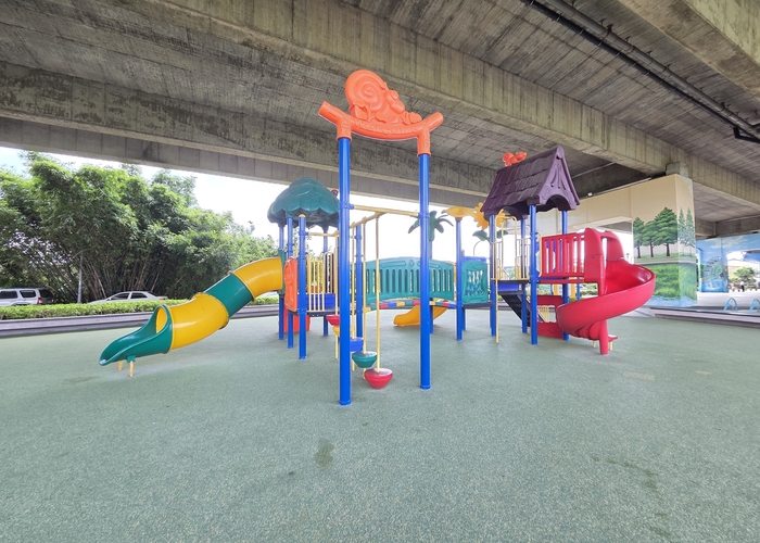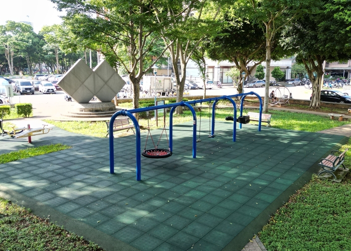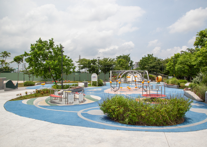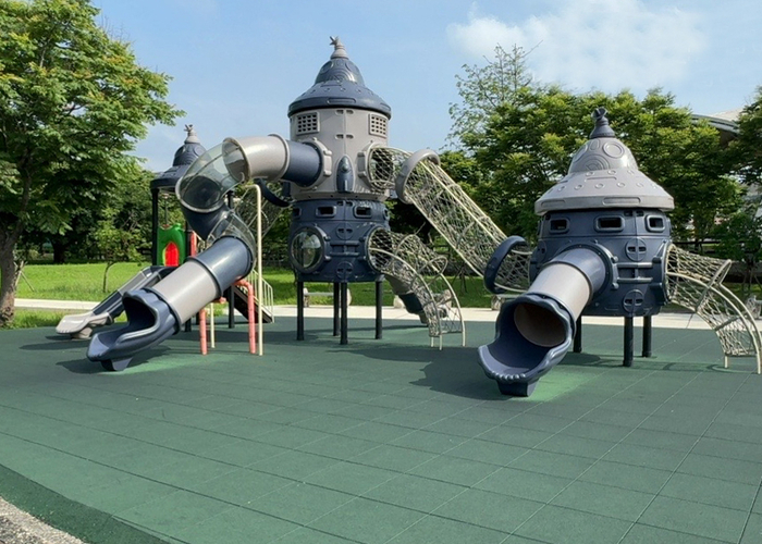 海洋風的兒童遊戲場,其中3米高的彩繪造型山丘在遊戲場內格外顯眼,魚兒身旁游還有彩色海龜作伴,彷彿置身海底世界!坐上溜滑梯滑入白沙坑,迷你挖土機、玩沙平台,滿足孩子的玩心。公園內除了設有常見的鞦韆,還有一組可360度旋轉的鞦韆,能讓孩子即刻變身小飛俠,享受乘風之樂。