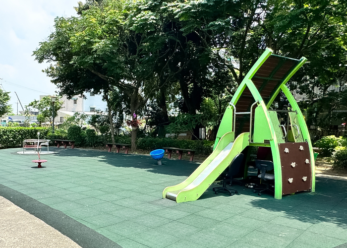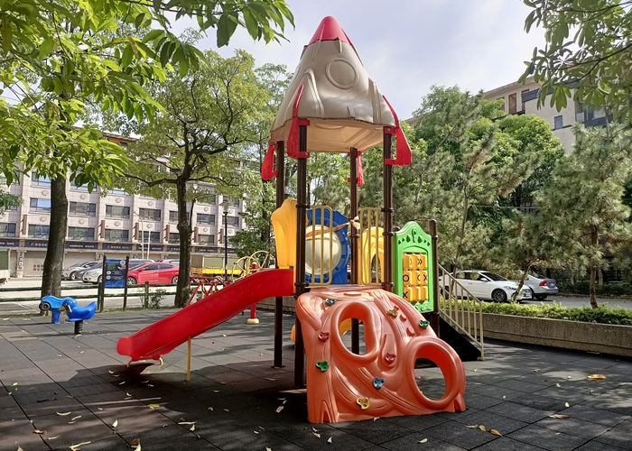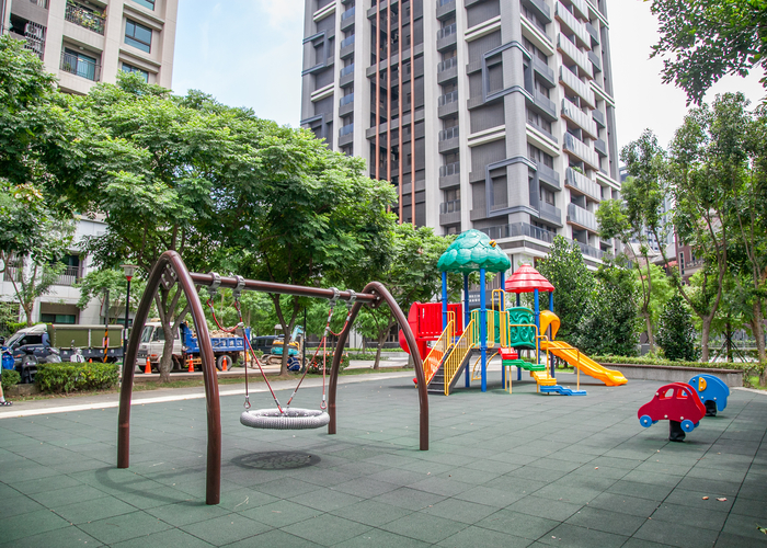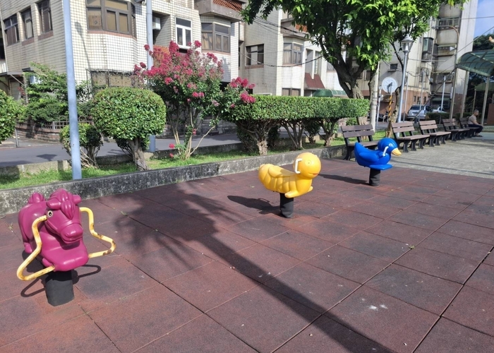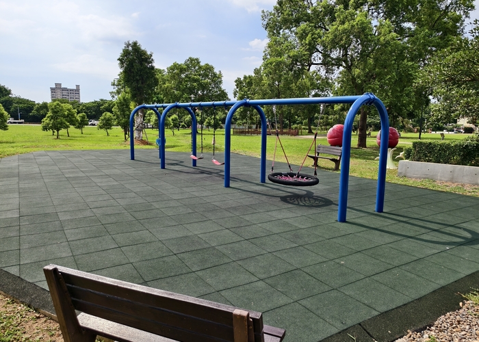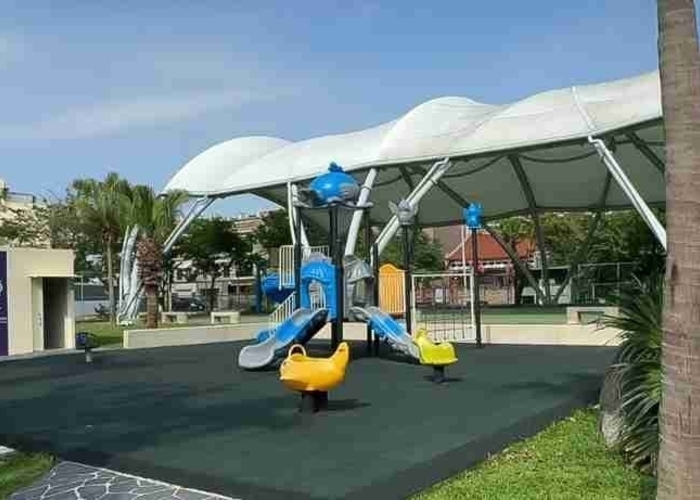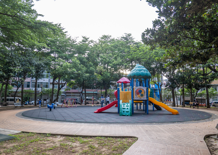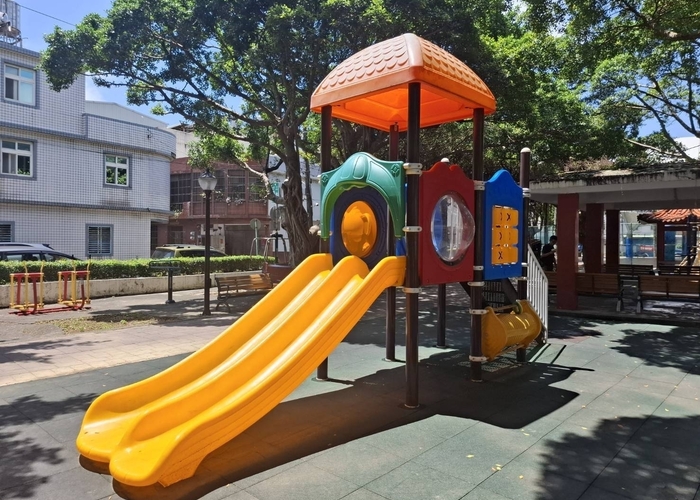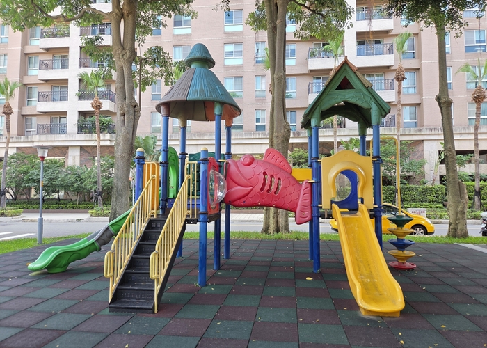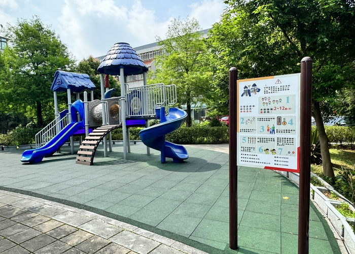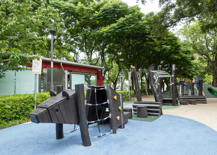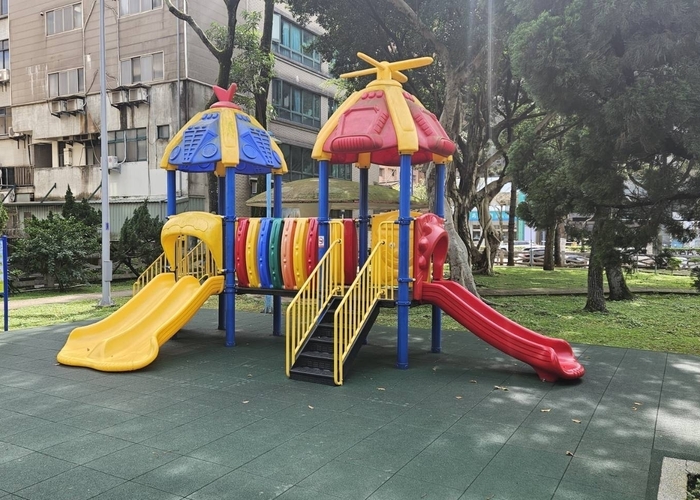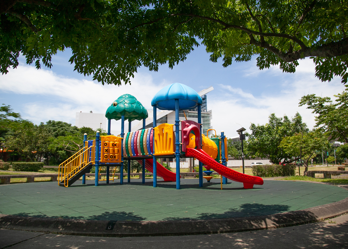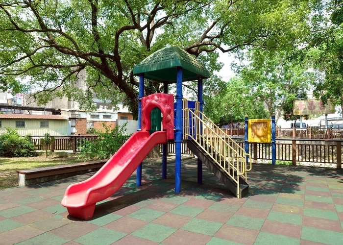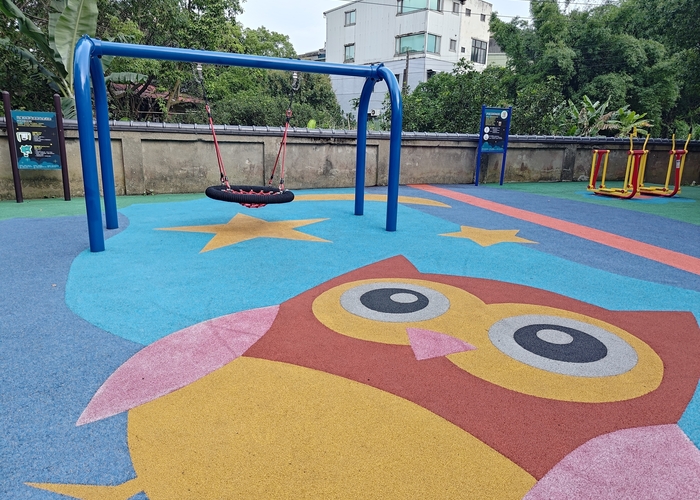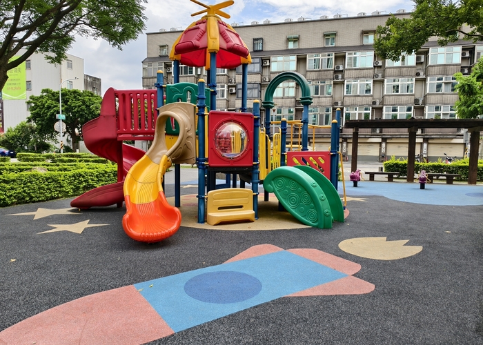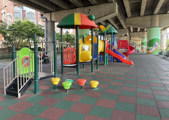 海洋風的兒童遊戲場,其中3米高的彩繪造型山丘在遊戲場內格外顯眼,魚兒身旁游還有彩色海龜作伴,彷彿置身海底世界!坐上溜滑梯滑入白沙坑,迷你挖土機、玩沙平台,滿足孩子的玩心。公園內除了設有常見的鞦韆,還有一組可360度旋轉的鞦韆,能讓孩子即刻變身小飛俠,享受乘風之樂。