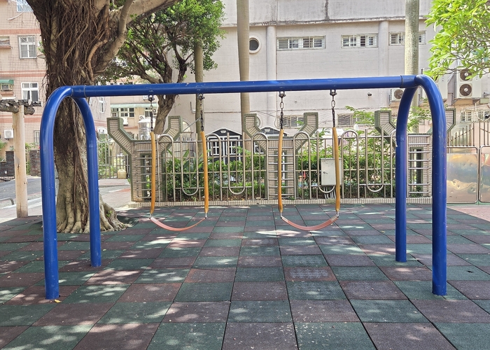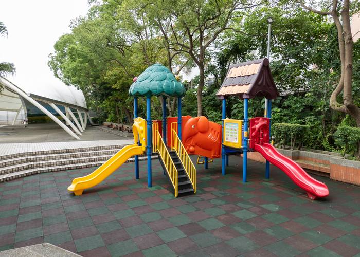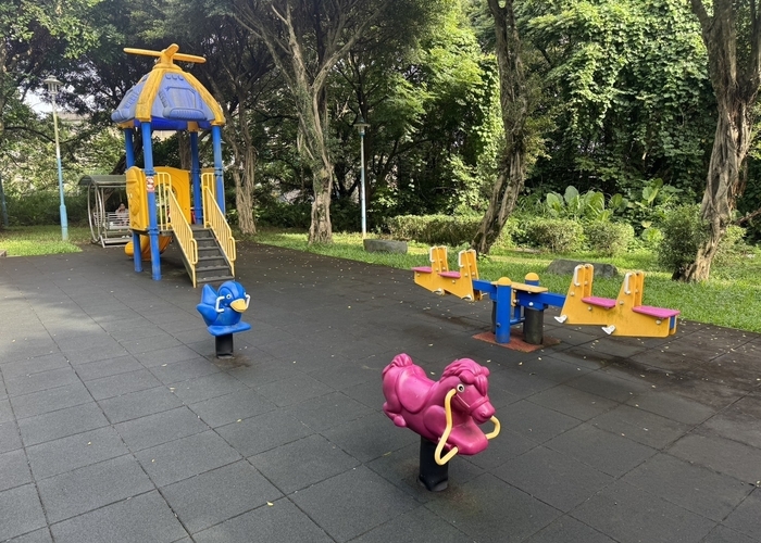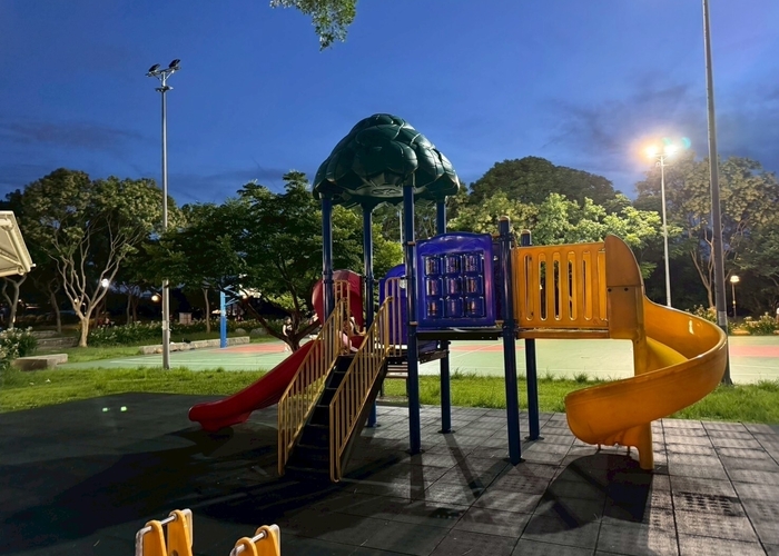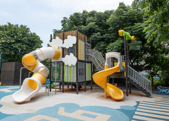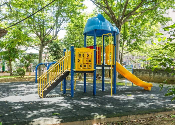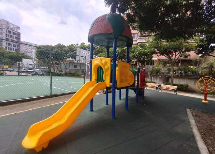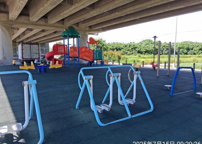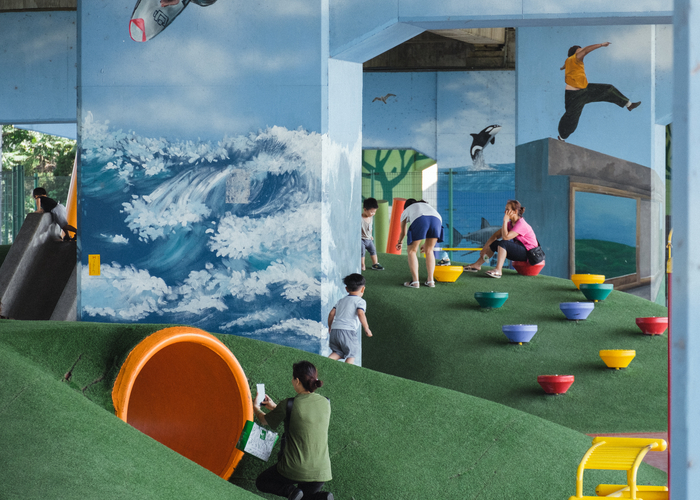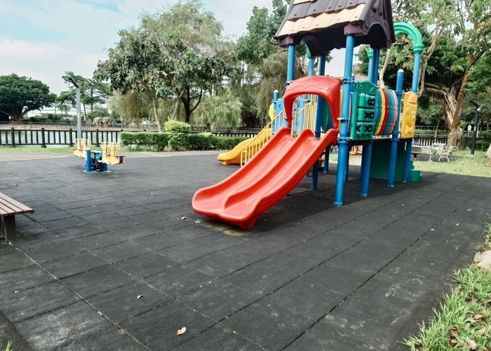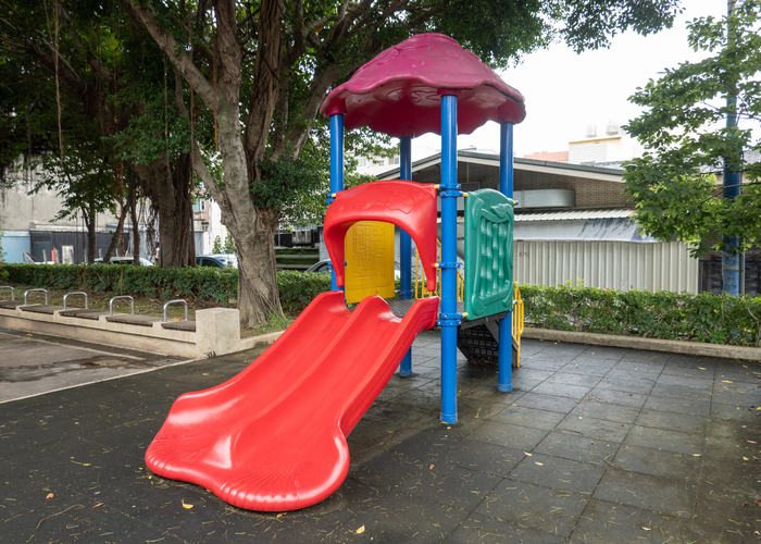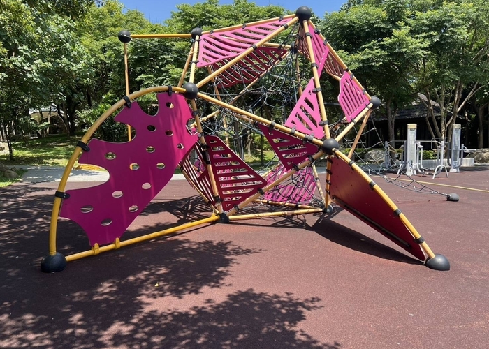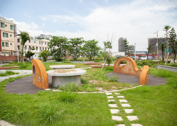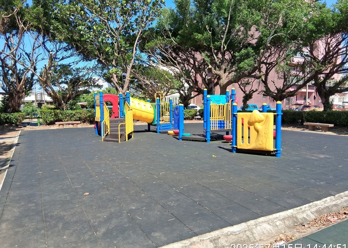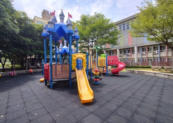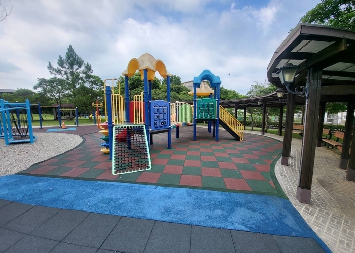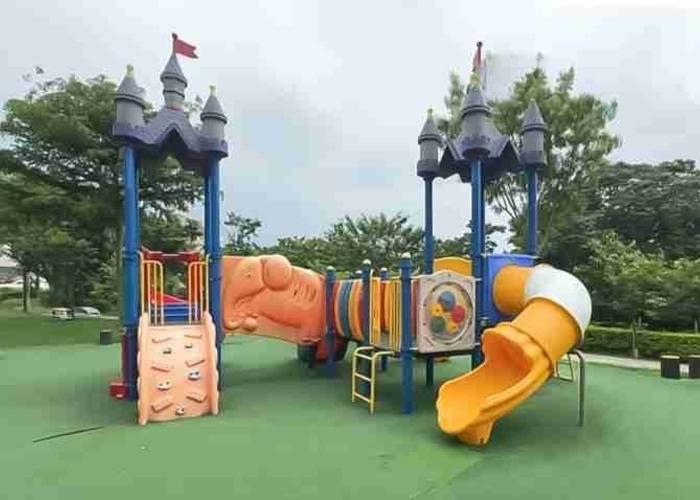 海洋風的兒童遊戲場,其中3米高的彩繪造型山丘在遊戲場內格外顯眼,魚兒身旁游還有彩色海龜作伴,彷彿置身海底世界!坐上溜滑梯滑入白沙坑,迷你挖土機、玩沙平台,滿足孩子的玩心。公園內除了設有常見的鞦韆,還有一組可360度旋轉的鞦韆,能讓孩子即刻變身小飛俠,享受乘風之樂。