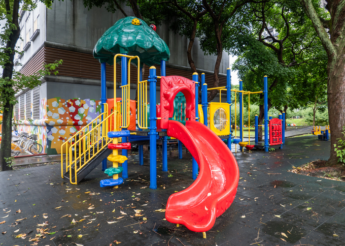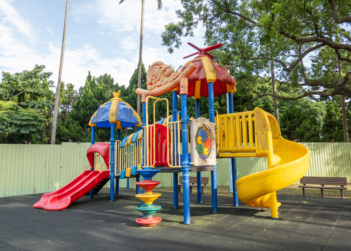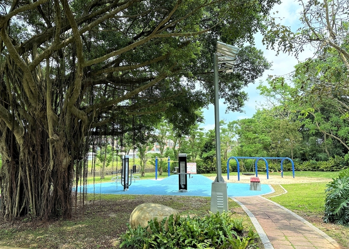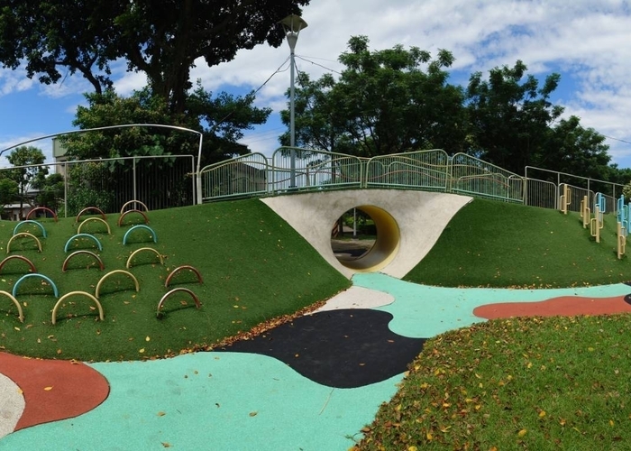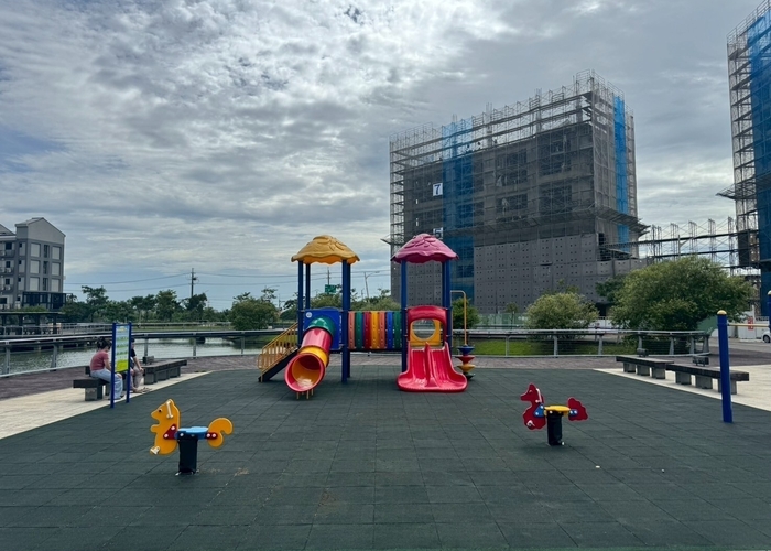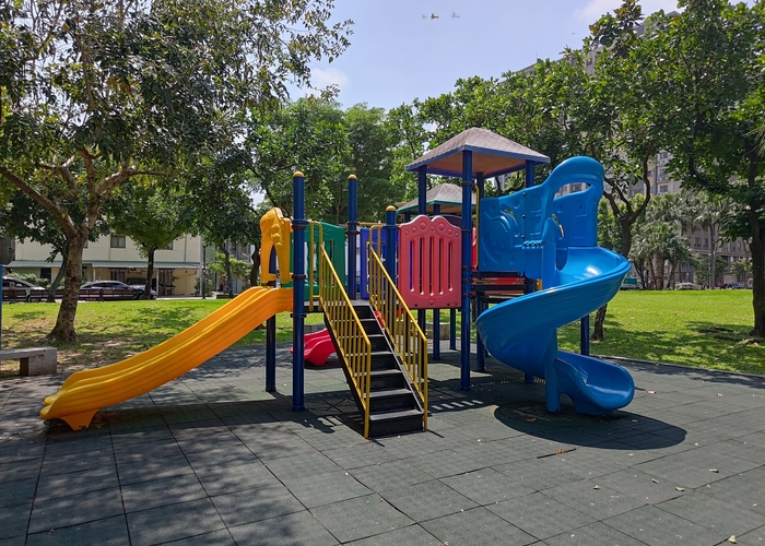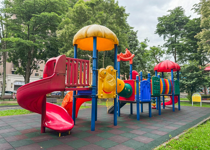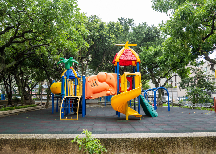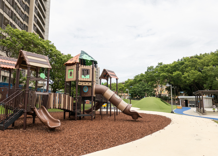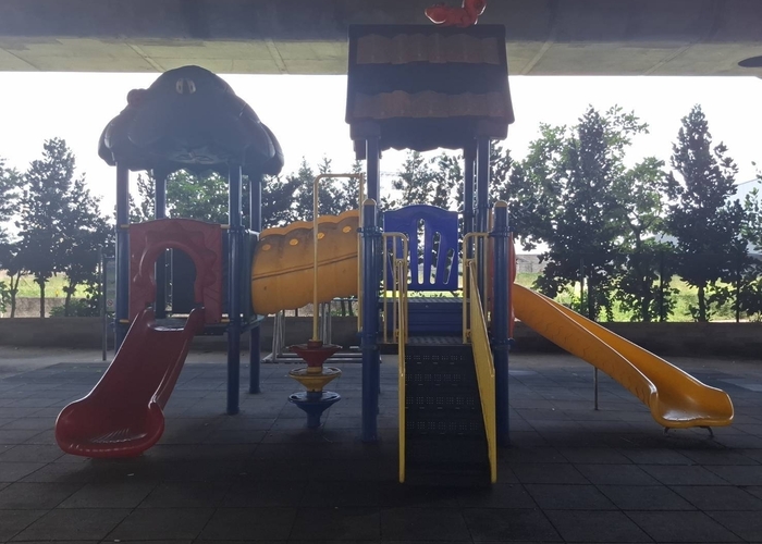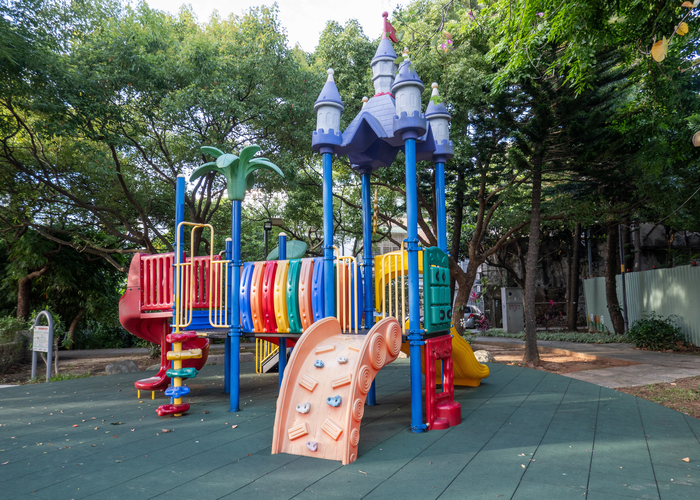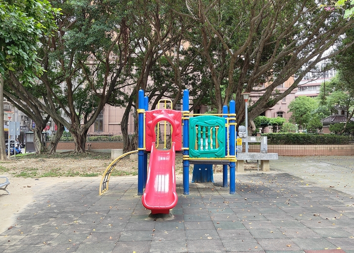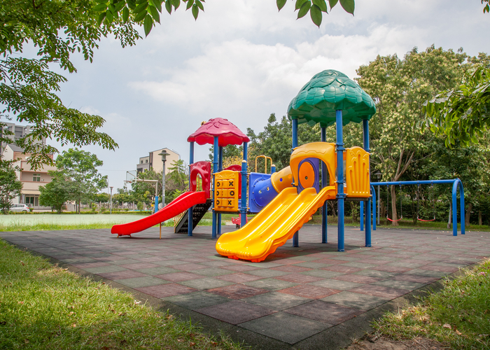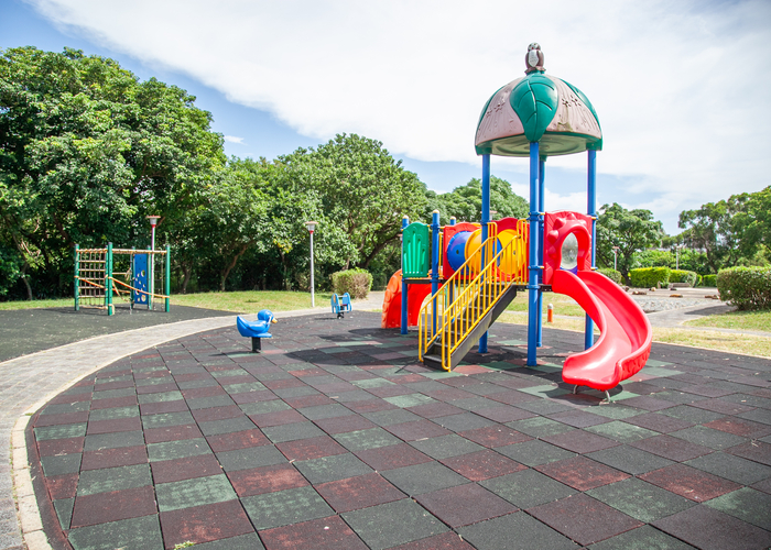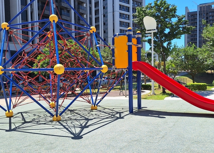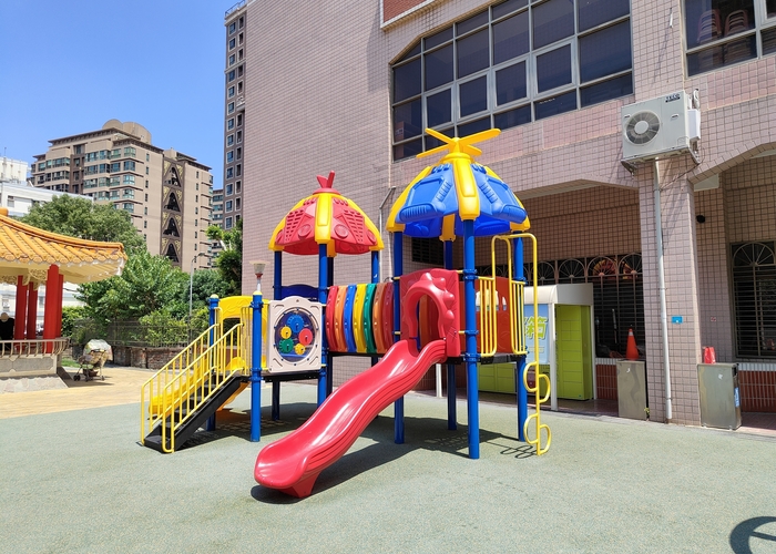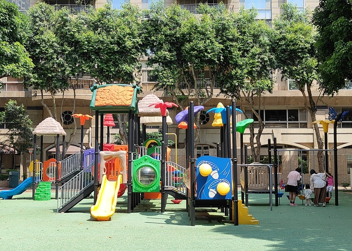 海洋風的兒童遊戲場,其中3米高的彩繪造型山丘在遊戲場內格外顯眼,魚兒身旁游還有彩色海龜作伴,彷彿置身海底世界!坐上溜滑梯滑入白沙坑,迷你挖土機、玩沙平台,滿足孩子的玩心。公園內除了設有常見的鞦韆,還有一組可360度旋轉的鞦韆,能讓孩子即刻變身小飛俠,享受乘風之樂。
