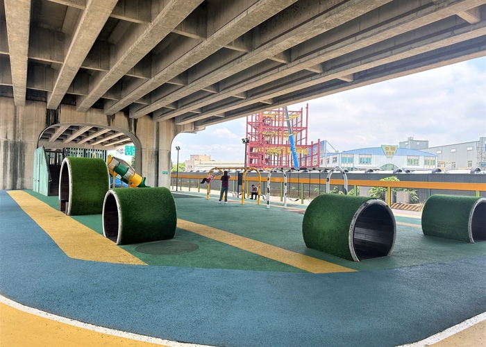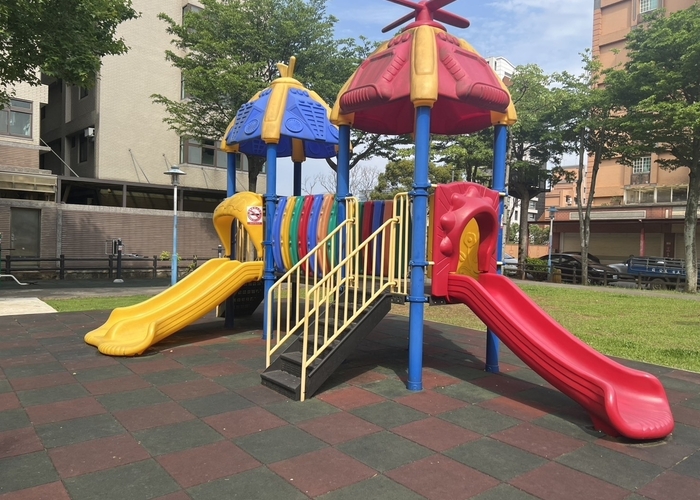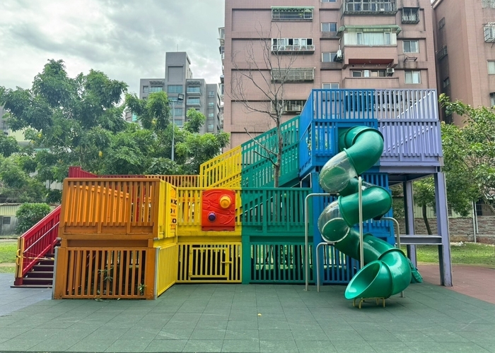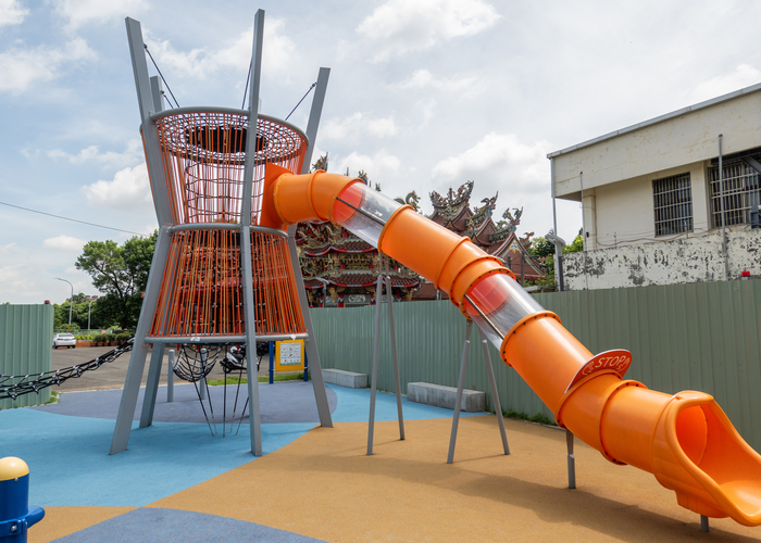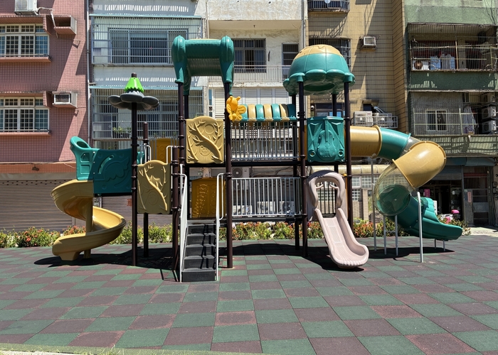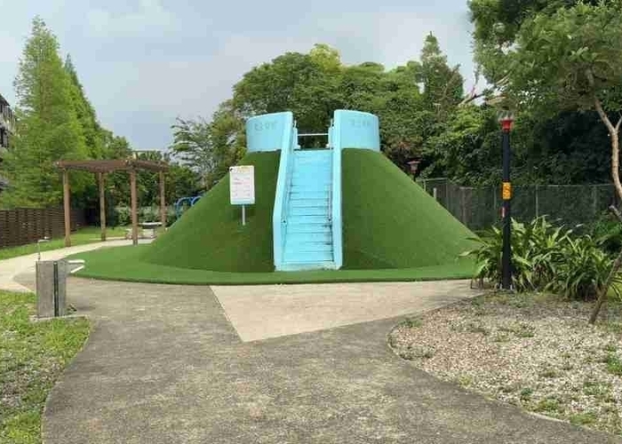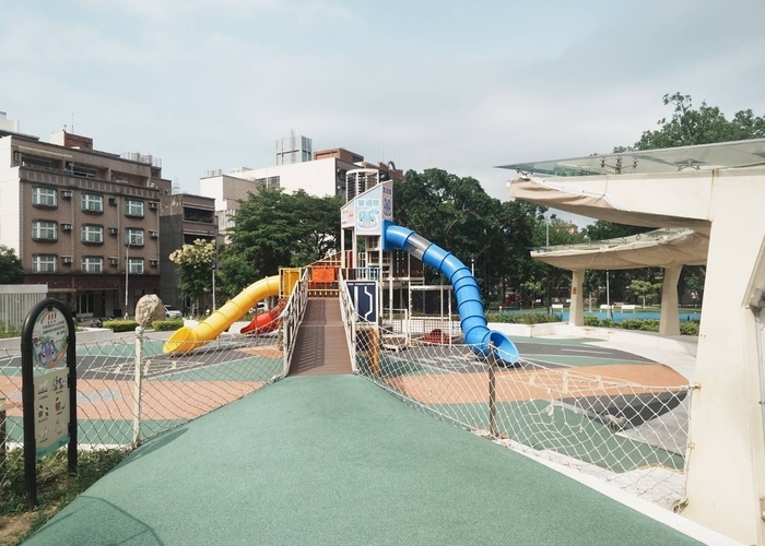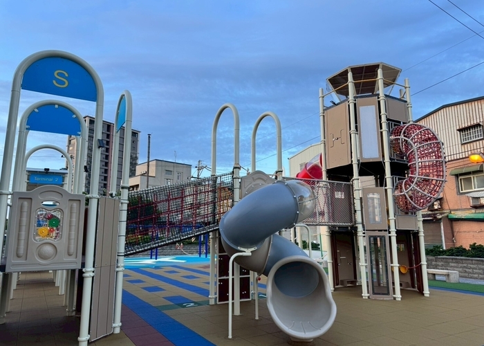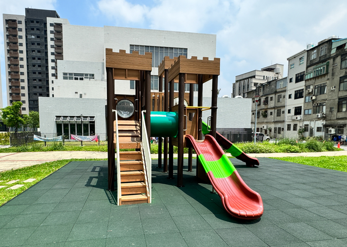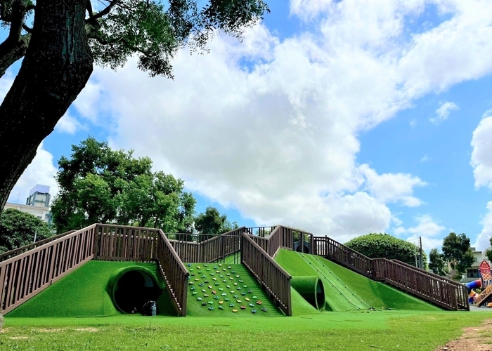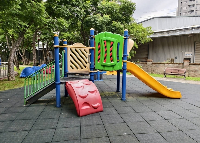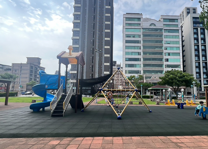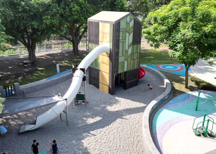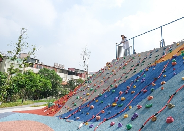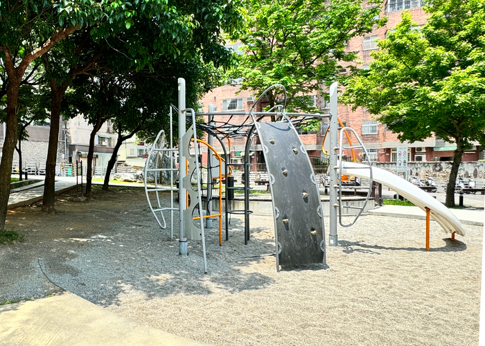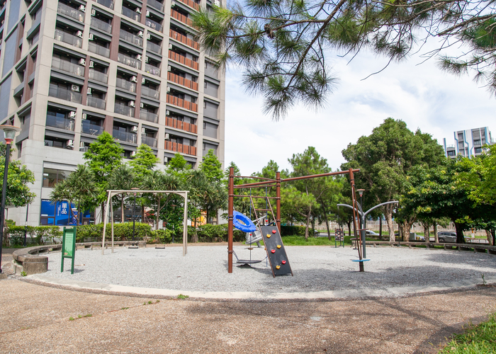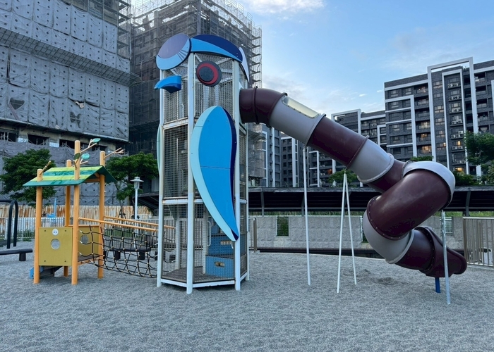 青埔公七公園位於青埔市民活動中心建築上方,巧妙運用建築高低差設置四道不同材質的管狀溜滑梯與攀岩設施,打造層次豐富的立體遊戲空間。園區整體融合自然造景與遊具設計,兼具挑戰性與趣味性,另設有沙坑區,提供更多元的親子互動體驗。