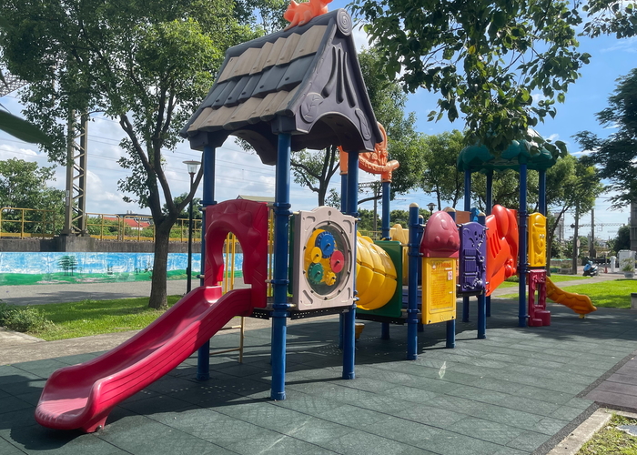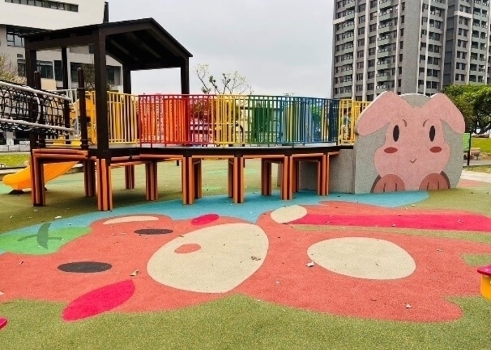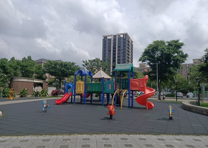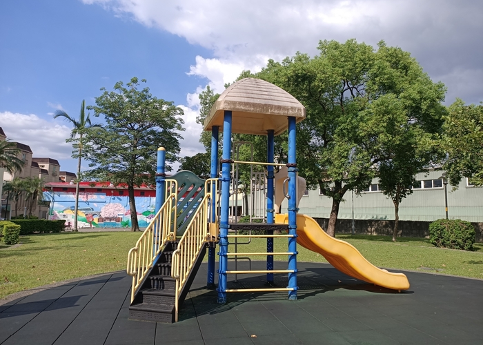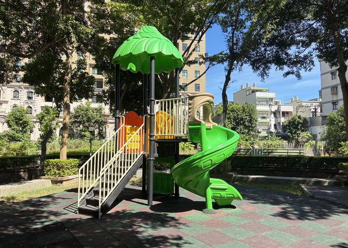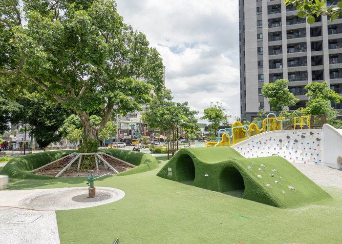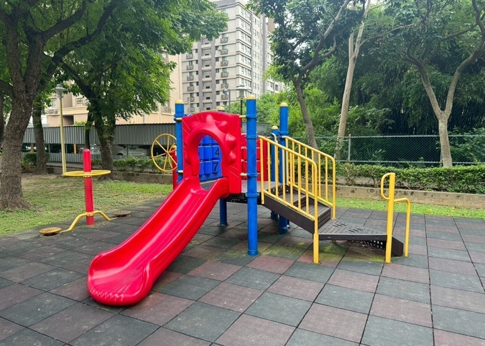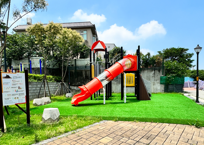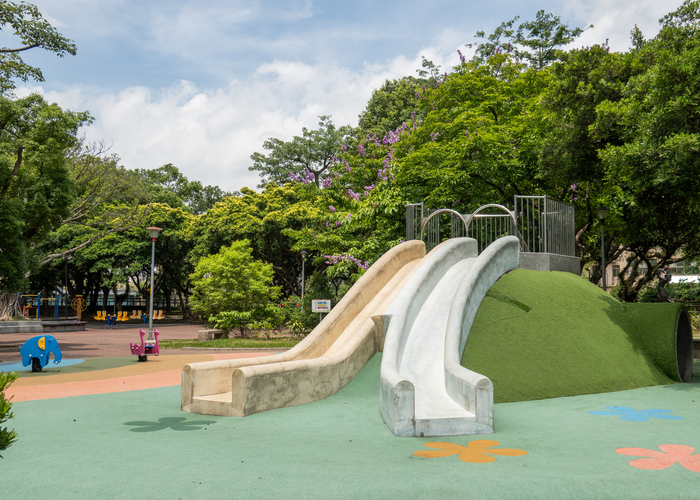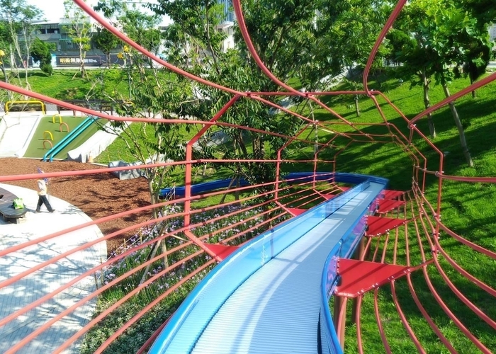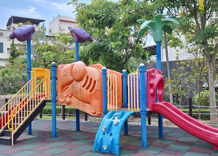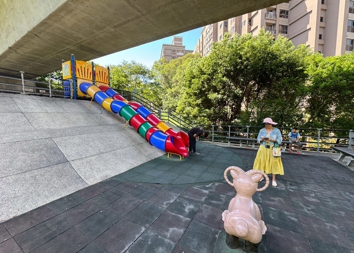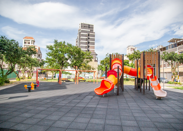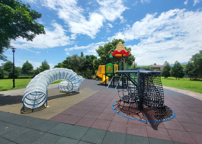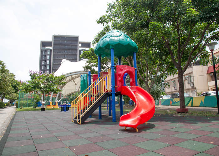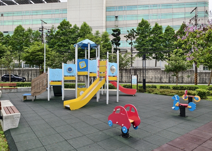 青埔公七公園位於青埔市民活動中心建築上方,巧妙運用建築高低差設置四道不同材質的管狀溜滑梯與攀岩設施,打造層次豐富的立體遊戲空間。園區整體融合自然造景與遊具設計,兼具挑戰性與趣味性,另設有沙坑區,提供更多元的親子互動體驗。