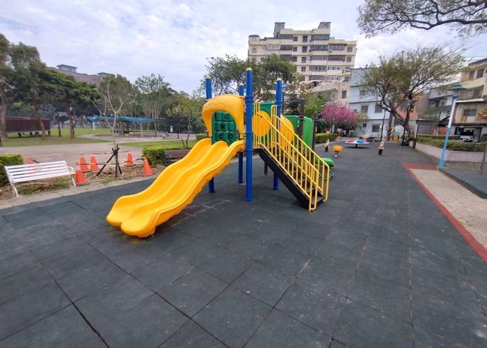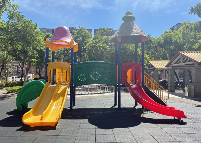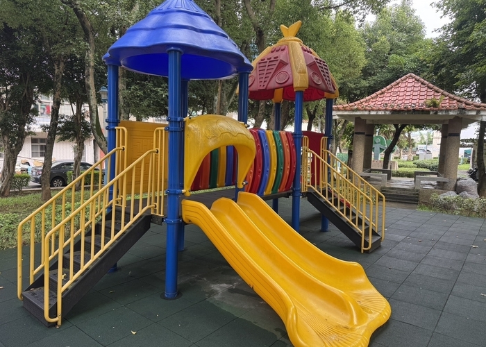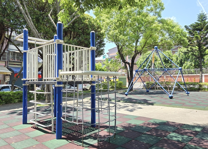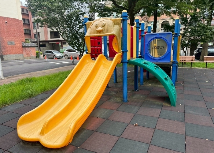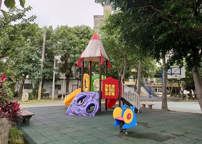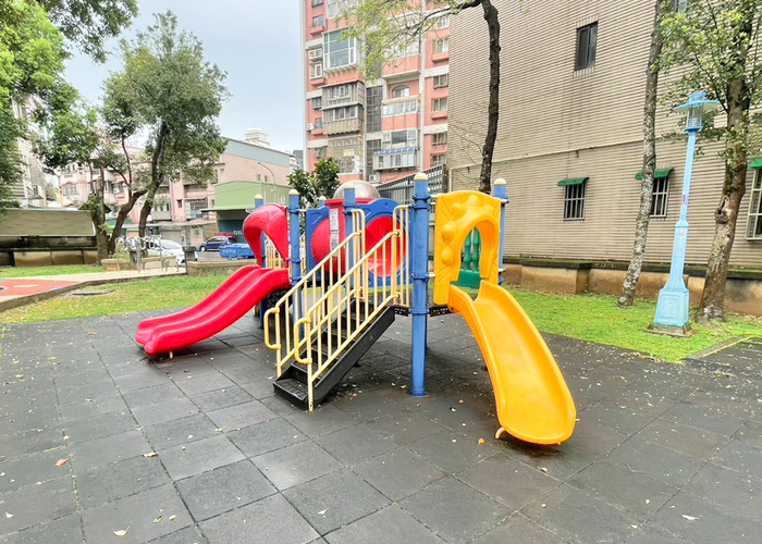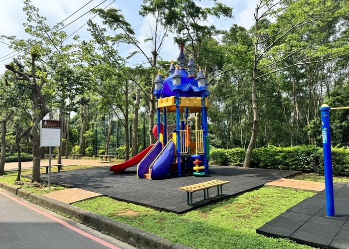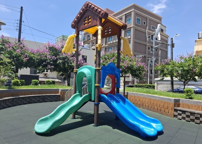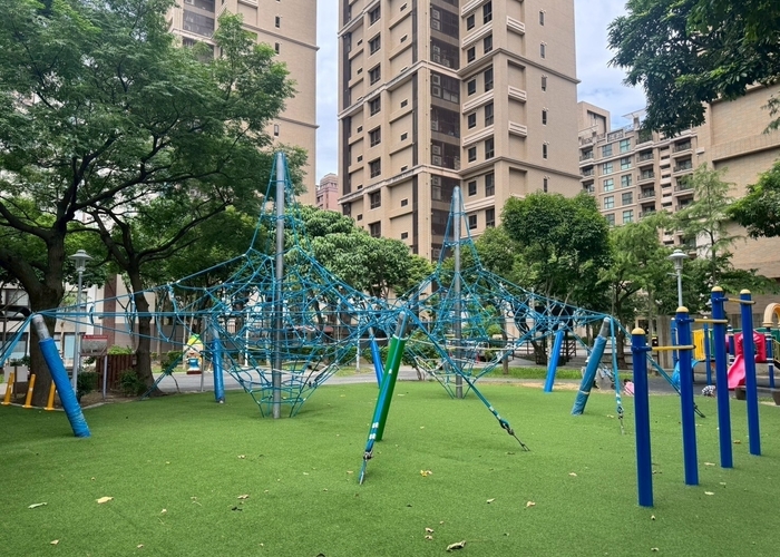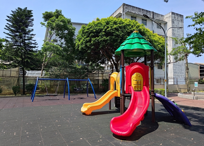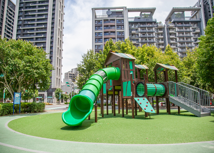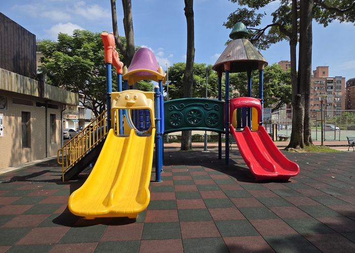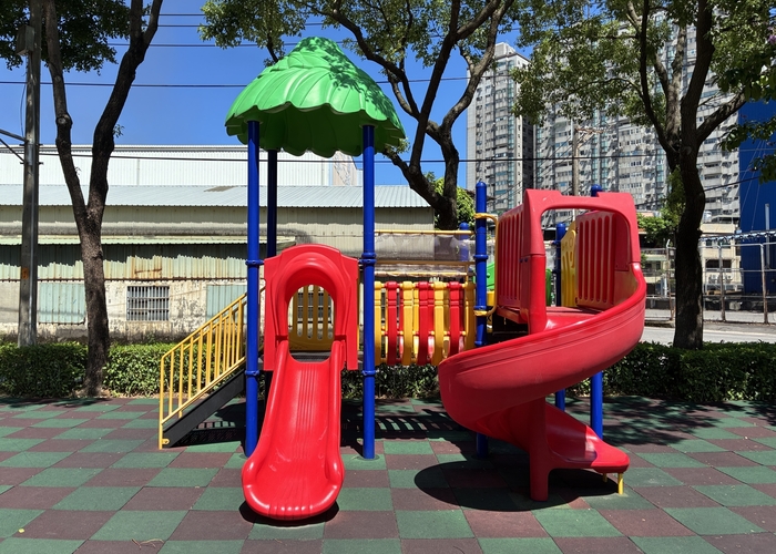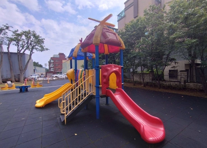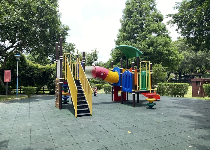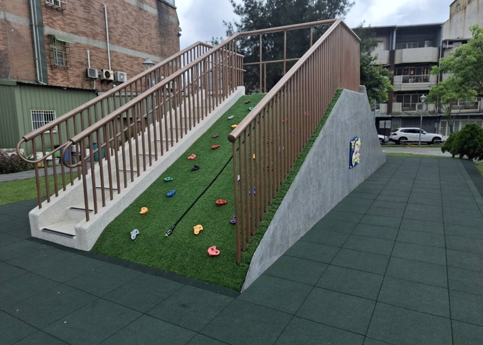 青埔公七公園位於青埔市民活動中心建築上方,巧妙運用建築高低差設置四道不同材質的管狀溜滑梯與攀岩設施,打造層次豐富的立體遊戲空間。園區整體融合自然造景與遊具設計,兼具挑戰性與趣味性,另設有沙坑區,提供更多元的親子互動體驗。