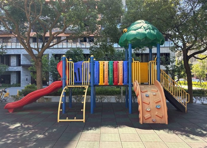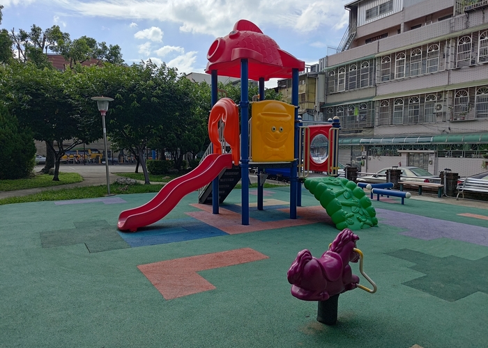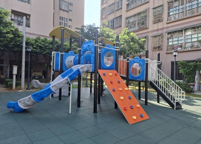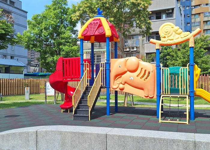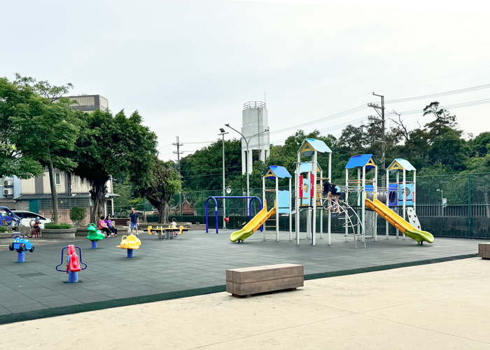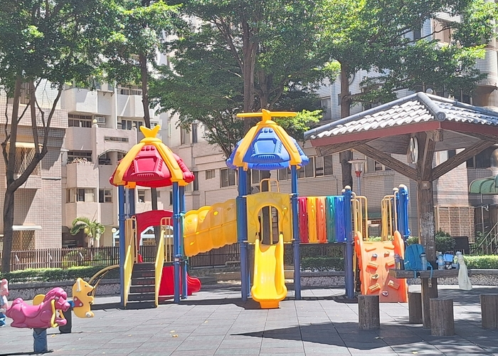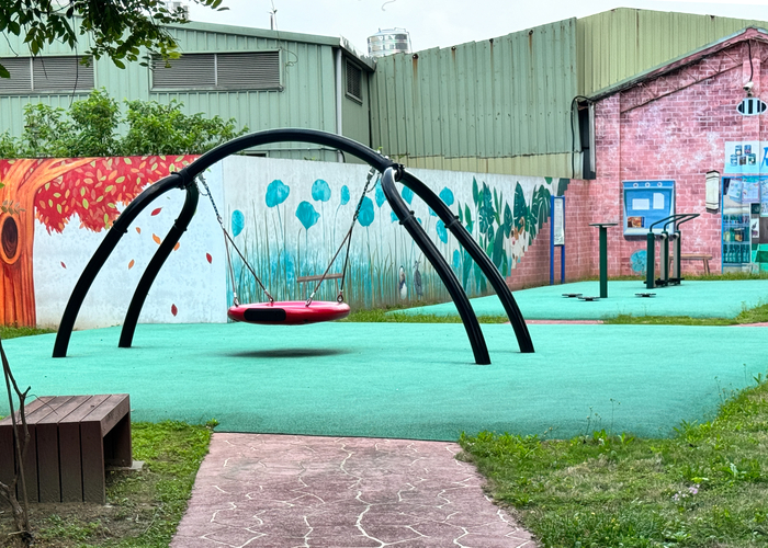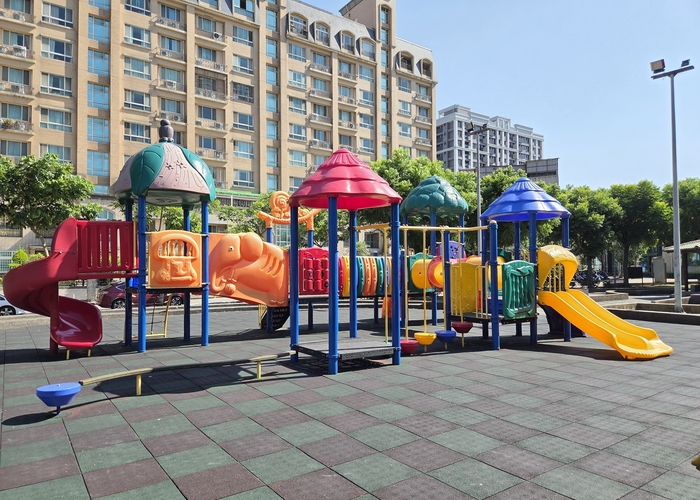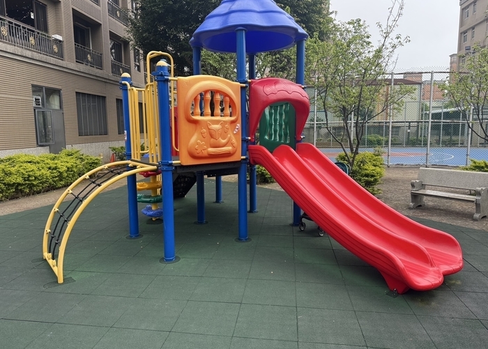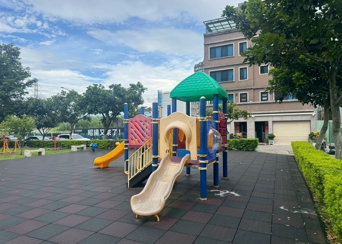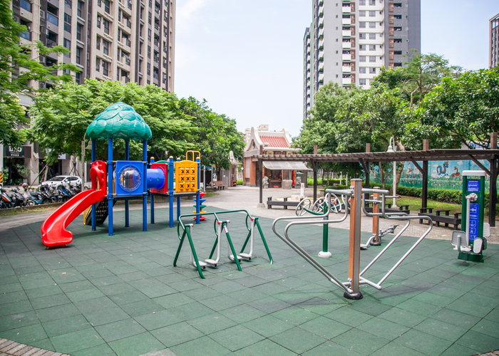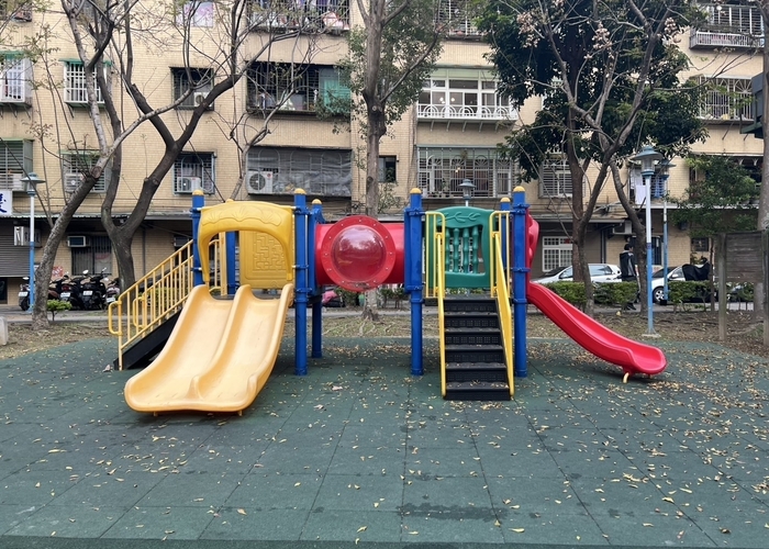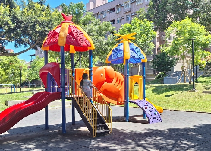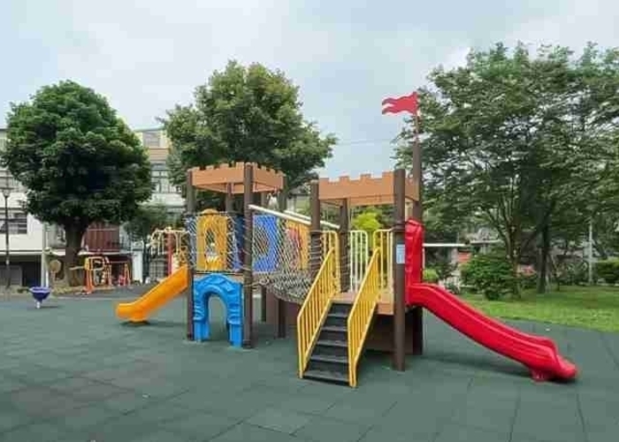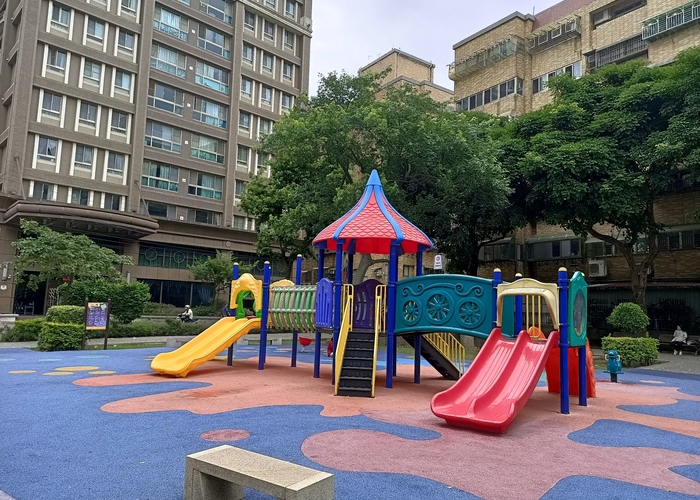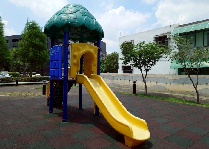 青埔公七公園位於青埔市民活動中心建築上方,巧妙運用建築高低差設置四道不同材質的管狀溜滑梯與攀岩設施,打造層次豐富的立體遊戲空間。園區整體融合自然造景與遊具設計,兼具挑戰性與趣味性,另設有沙坑區,提供更多元的親子互動體驗。