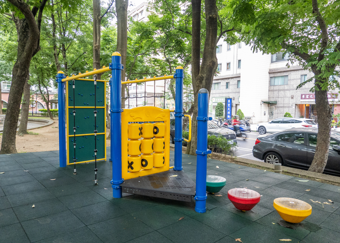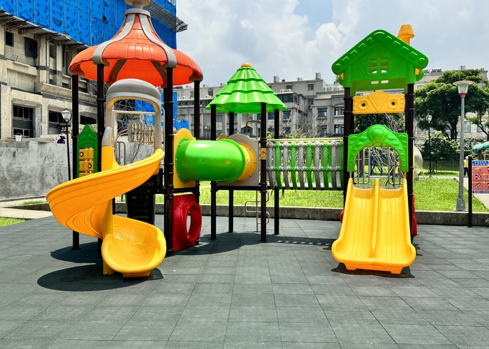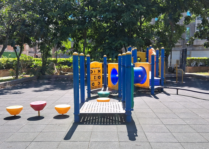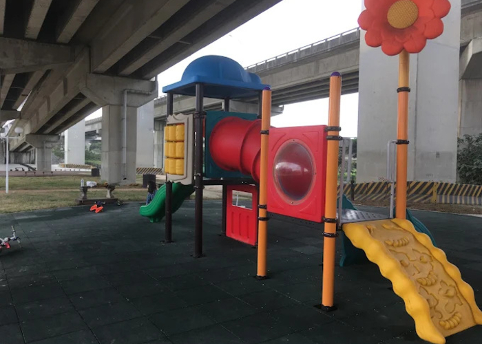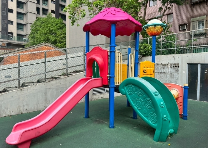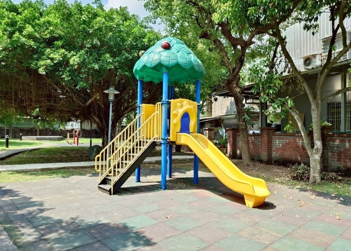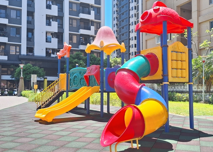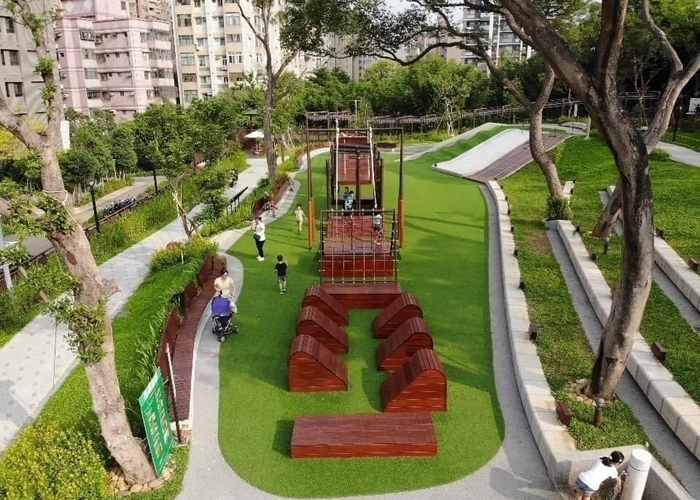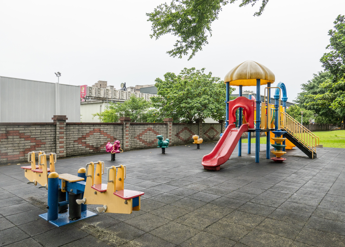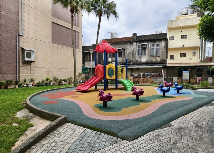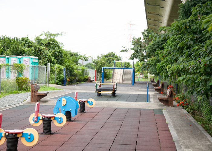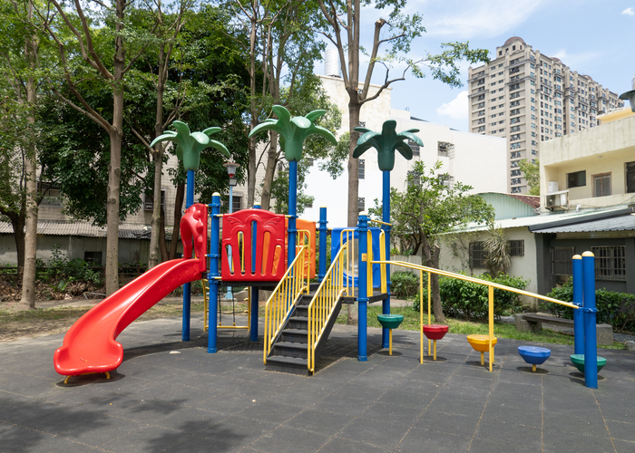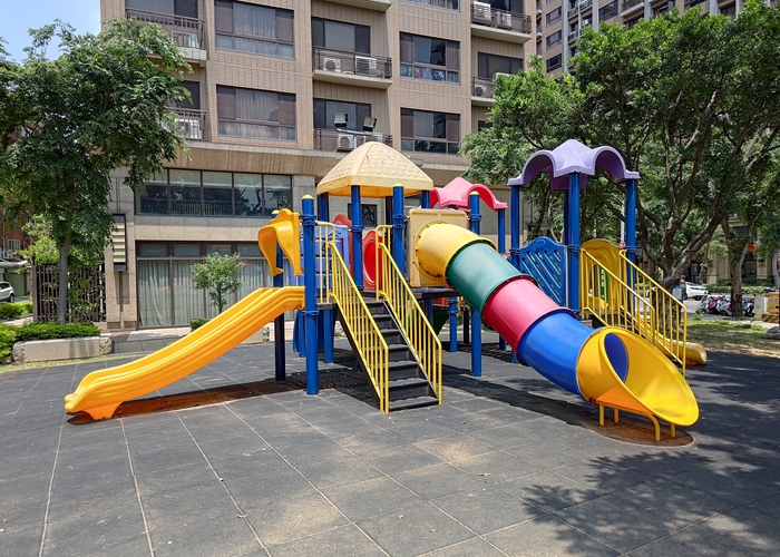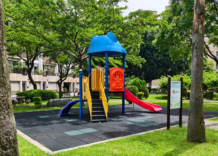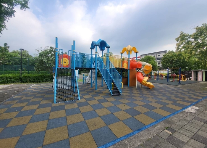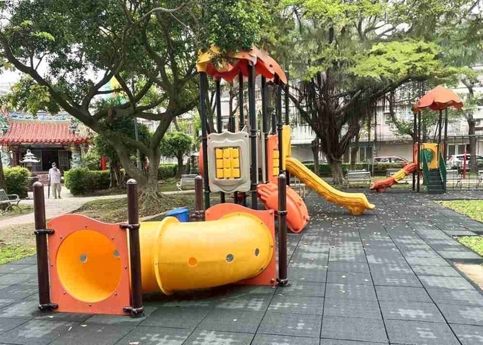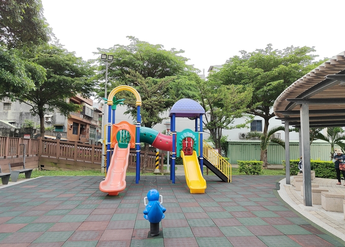 青埔公七公園位於青埔市民活動中心建築上方,巧妙運用建築高低差設置四道不同材質的管狀溜滑梯與攀岩設施,打造層次豐富的立體遊戲空間。園區整體融合自然造景與遊具設計,兼具挑戰性與趣味性,另設有沙坑區,提供更多元的親子互動體驗。