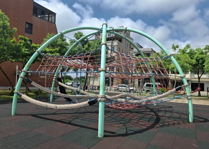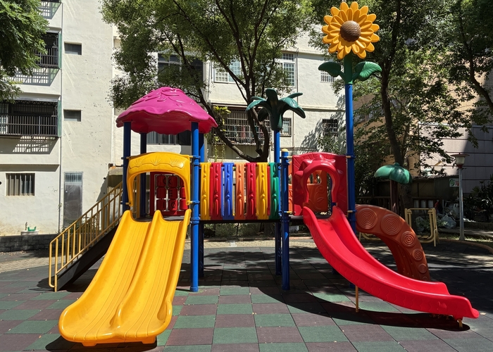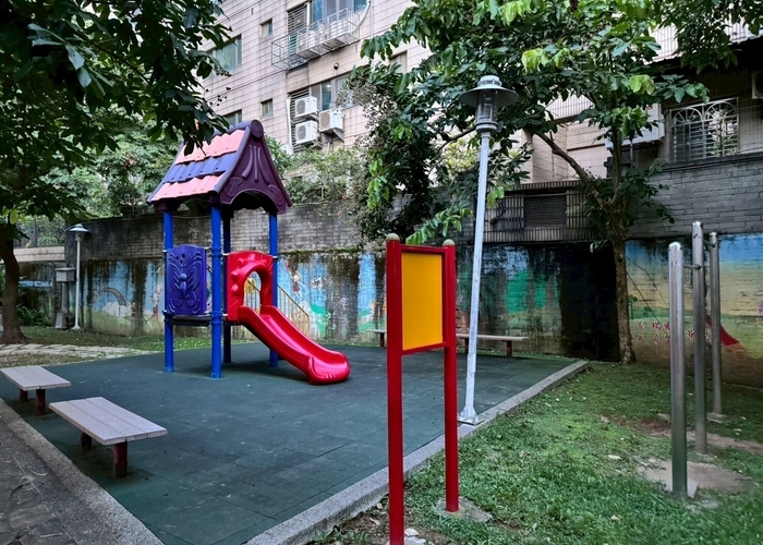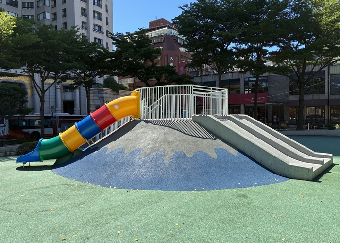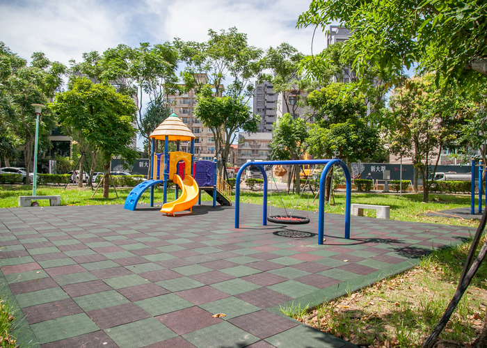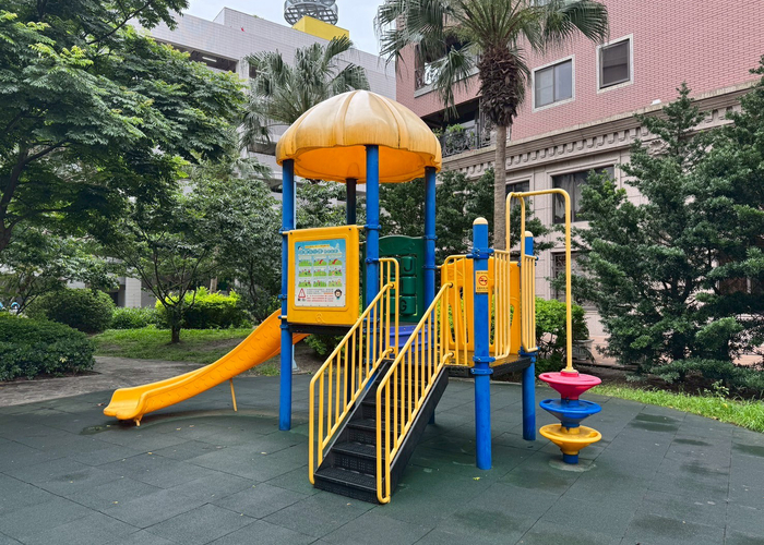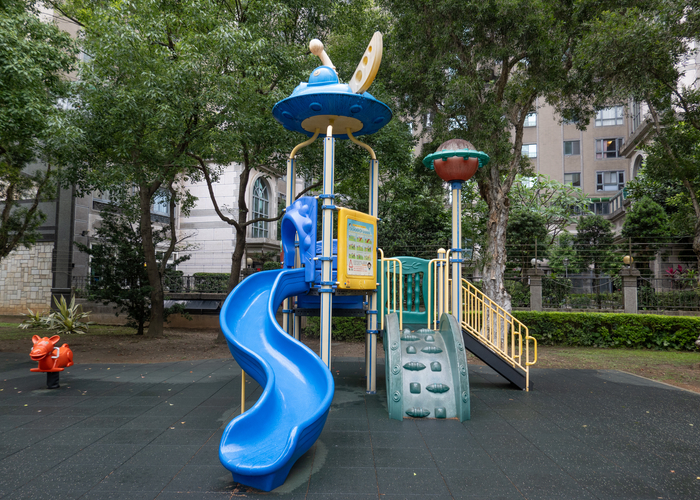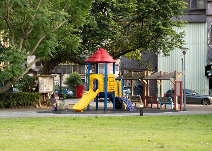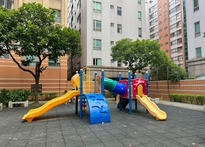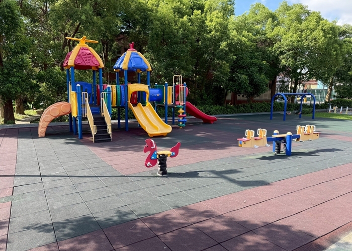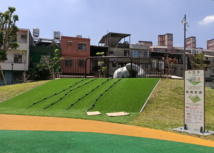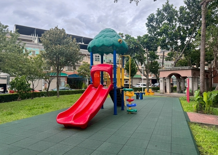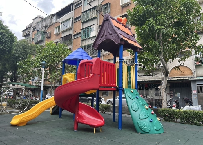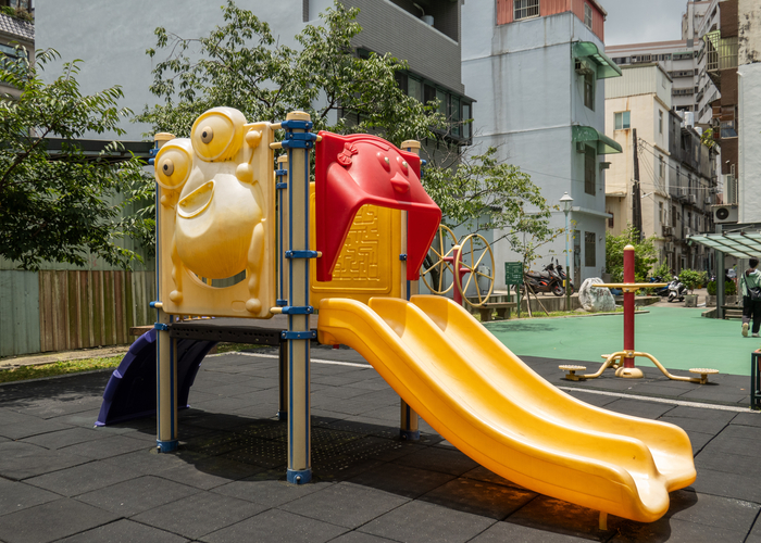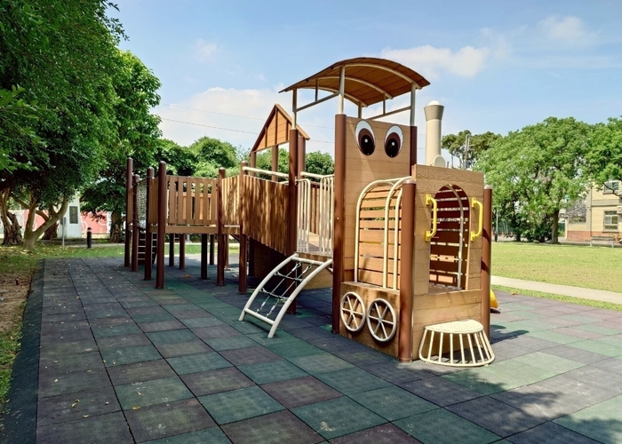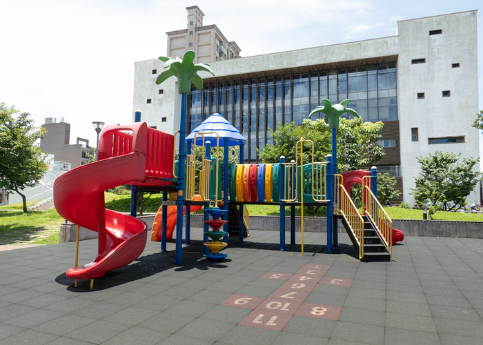 青埔公七公園位於青埔市民活動中心建築上方,巧妙運用建築高低差設置四道不同材質的管狀溜滑梯與攀岩設施,打造層次豐富的立體遊戲空間。園區整體融合自然造景與遊具設計,兼具挑戰性與趣味性,另設有沙坑區,提供更多元的親子互動體驗。