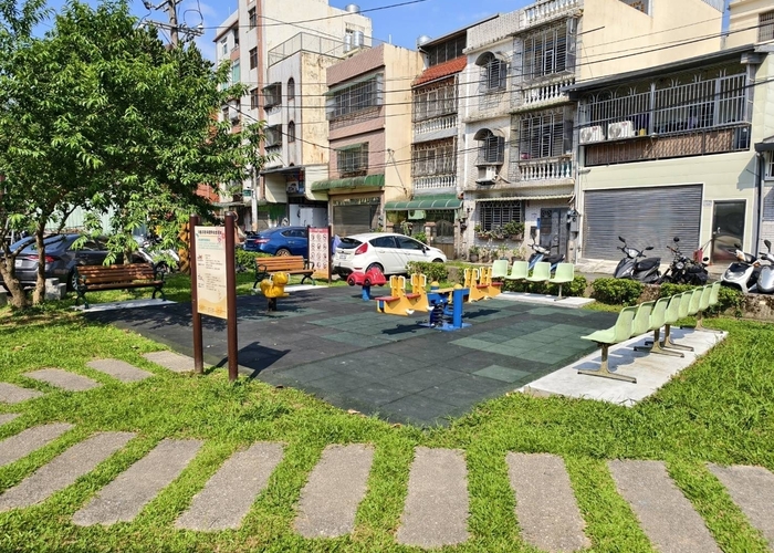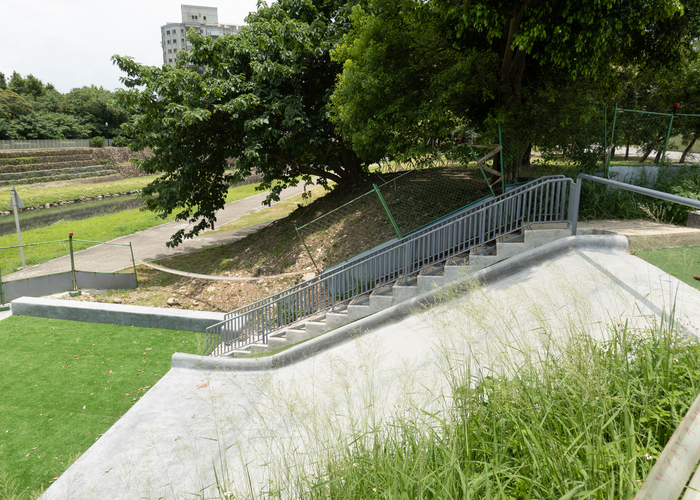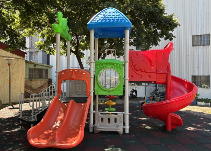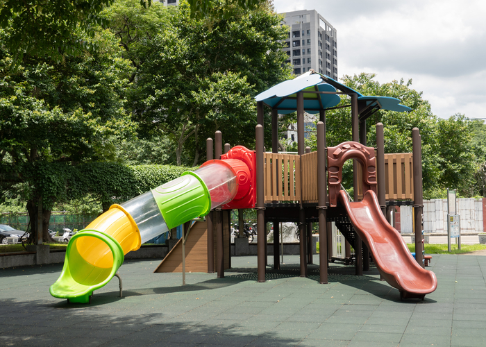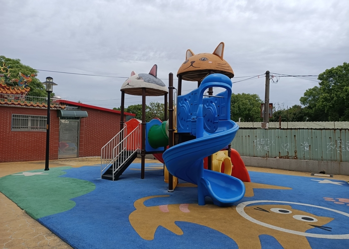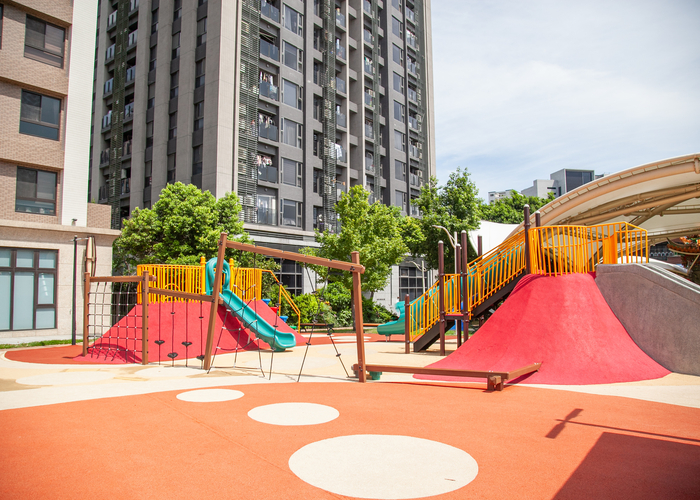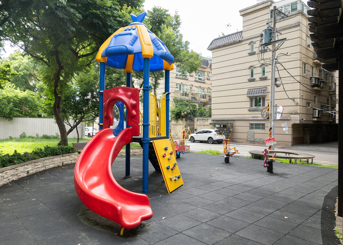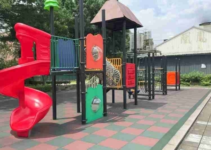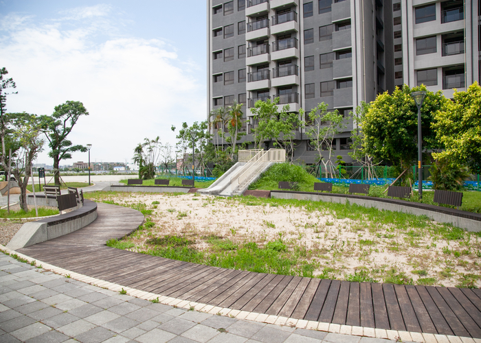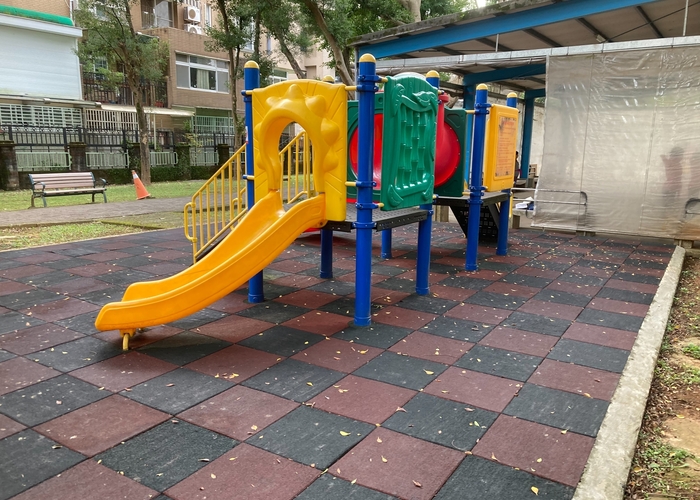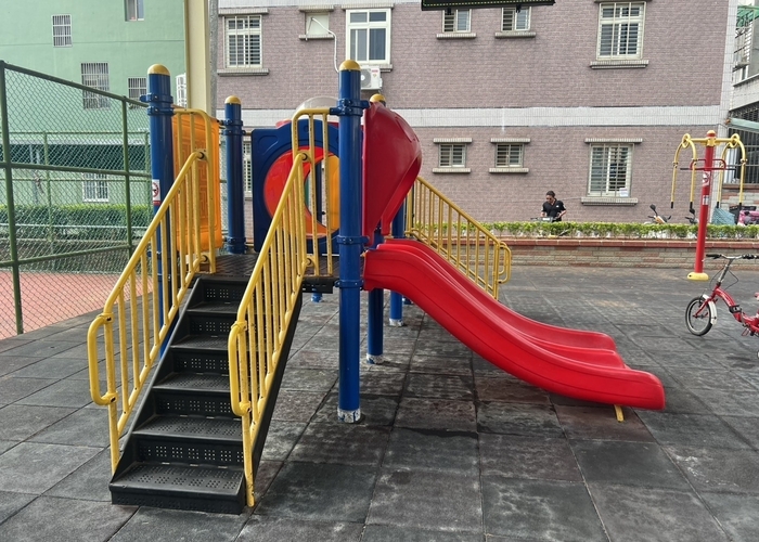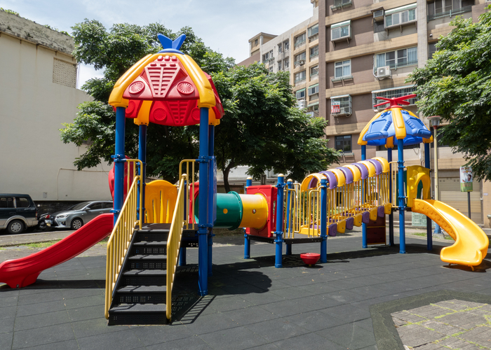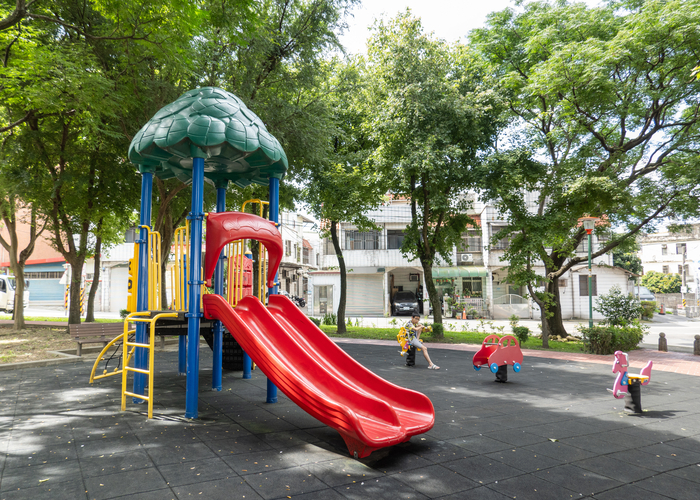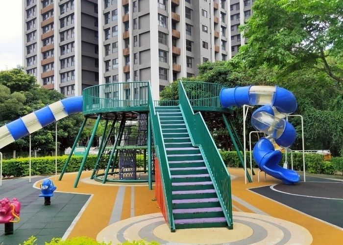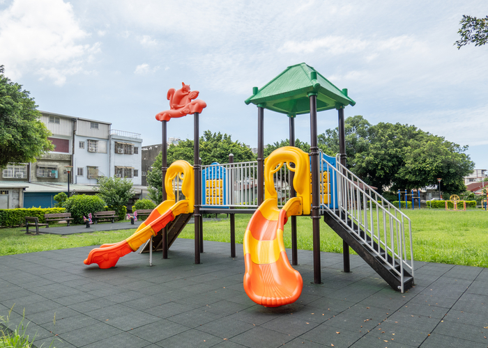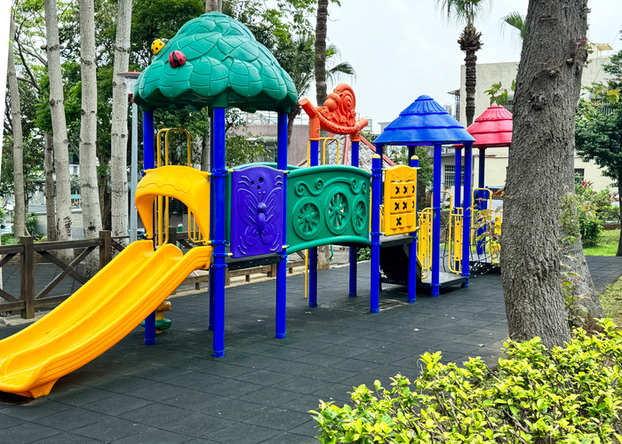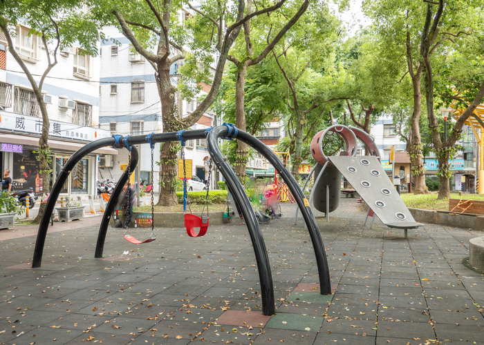 青埔公七公園位於青埔市民活動中心建築上方,巧妙運用建築高低差設置四道不同材質的管狀溜滑梯與攀岩設施,打造層次豐富的立體遊戲空間。園區整體融合自然造景與遊具設計,兼具挑戰性與趣味性,另設有沙坑區,提供更多元的親子互動體驗。