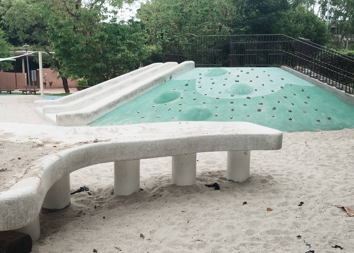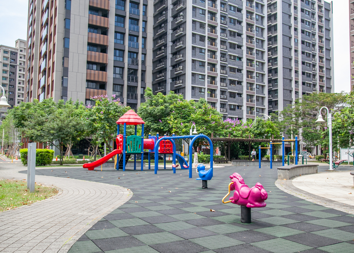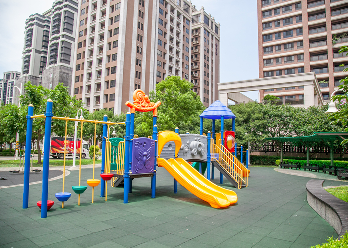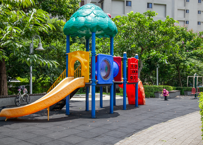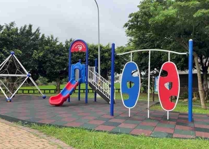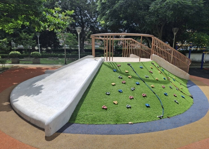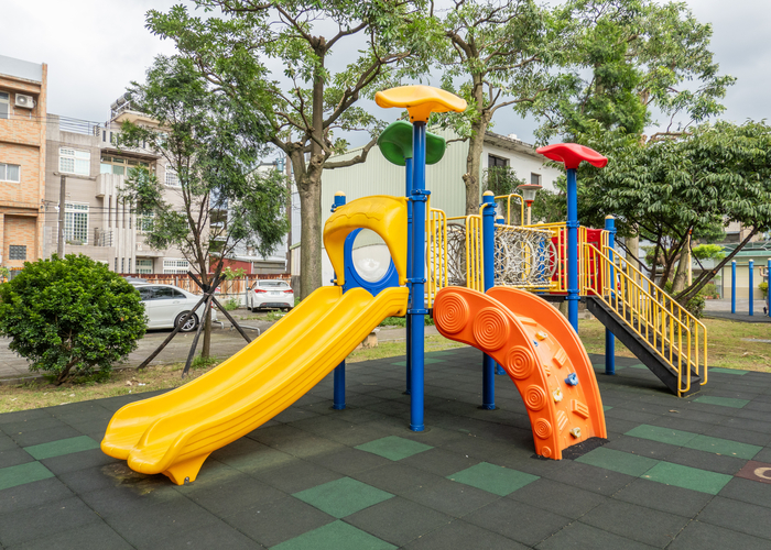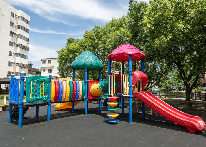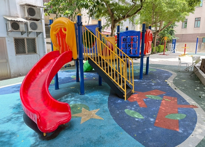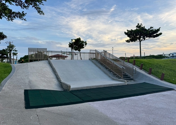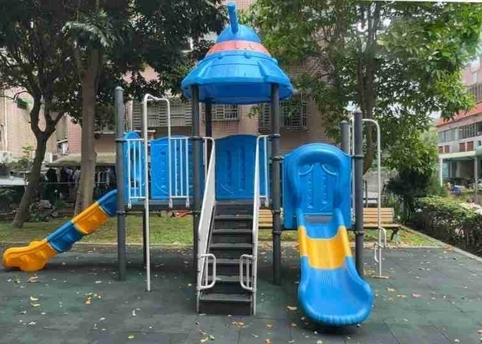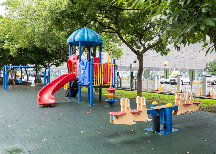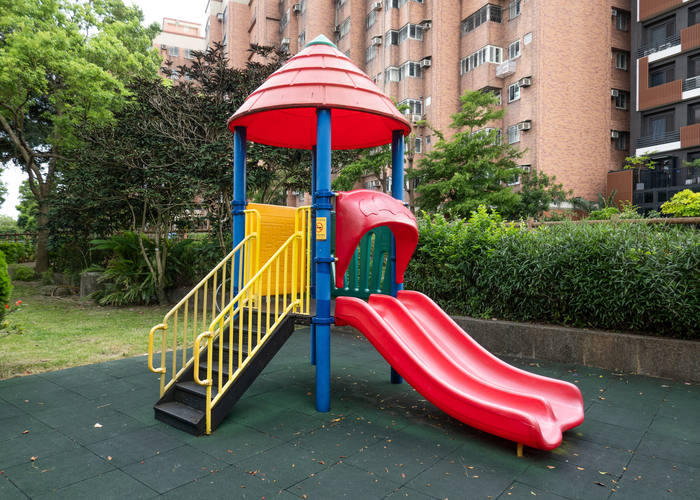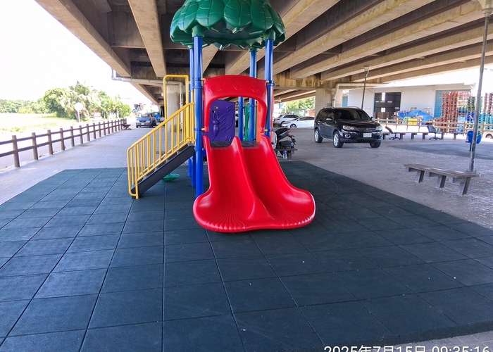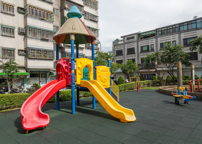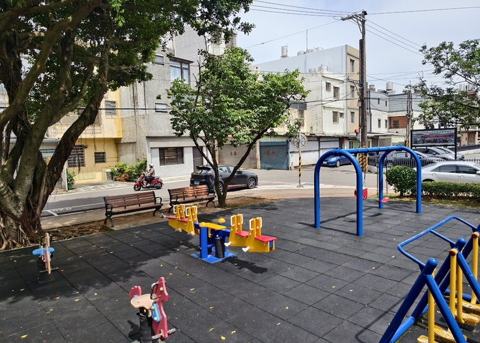 青埔公七公園位於青埔市民活動中心建築上方,巧妙運用建築高低差設置四道不同材質的管狀溜滑梯與攀岩設施,打造層次豐富的立體遊戲空間。園區整體融合自然造景與遊具設計,兼具挑戰性與趣味性,另設有沙坑區,提供更多元的親子互動體驗。