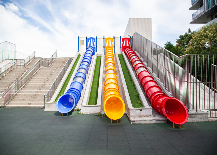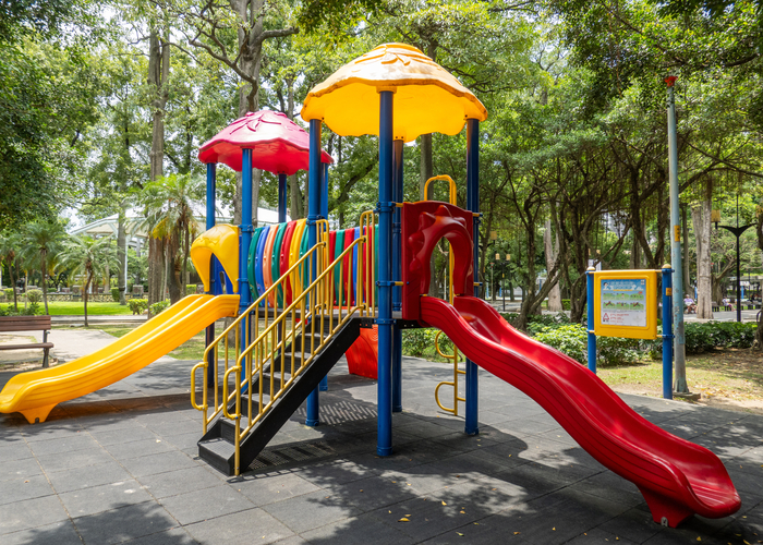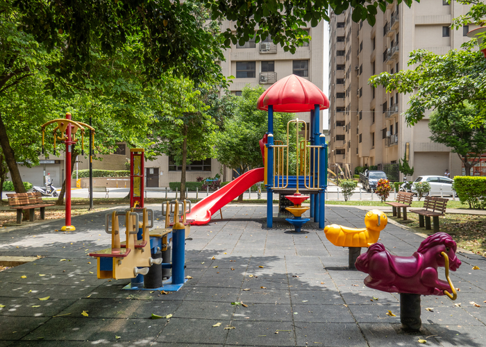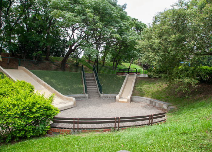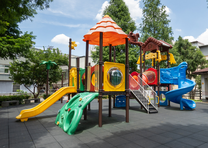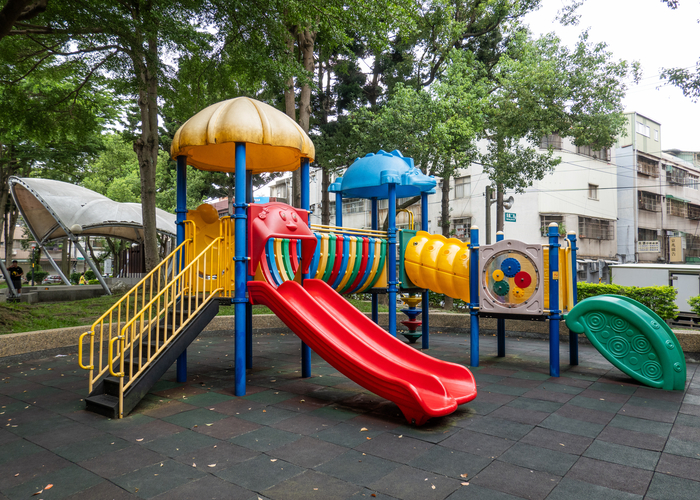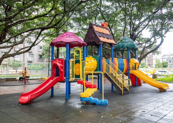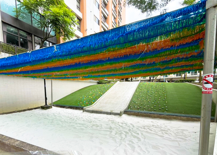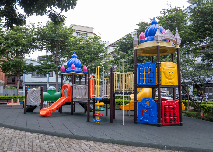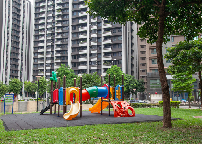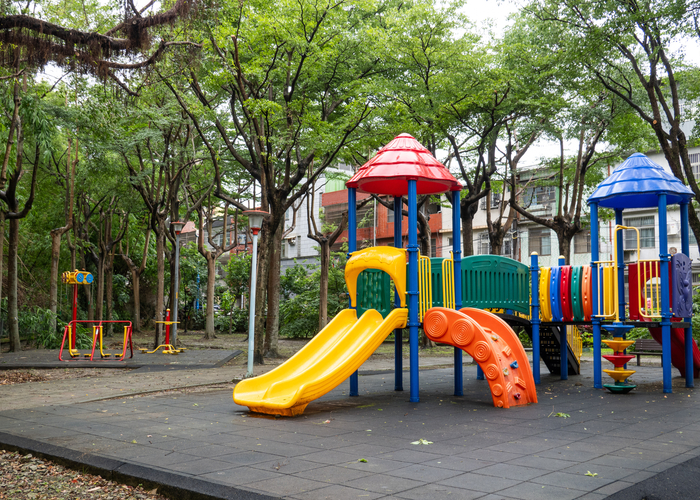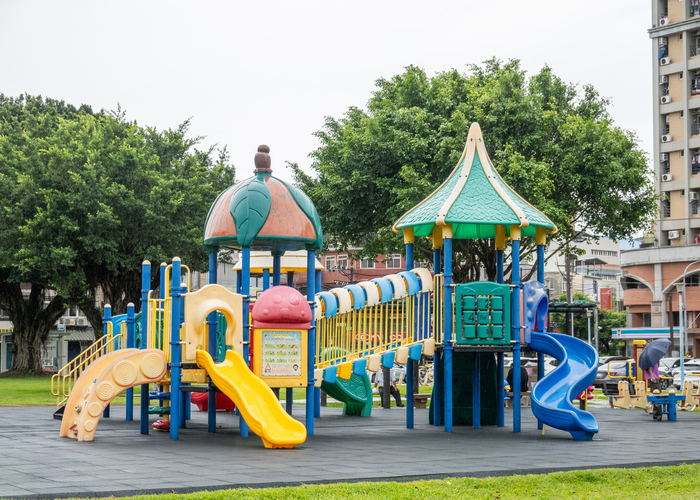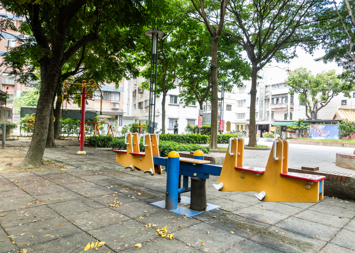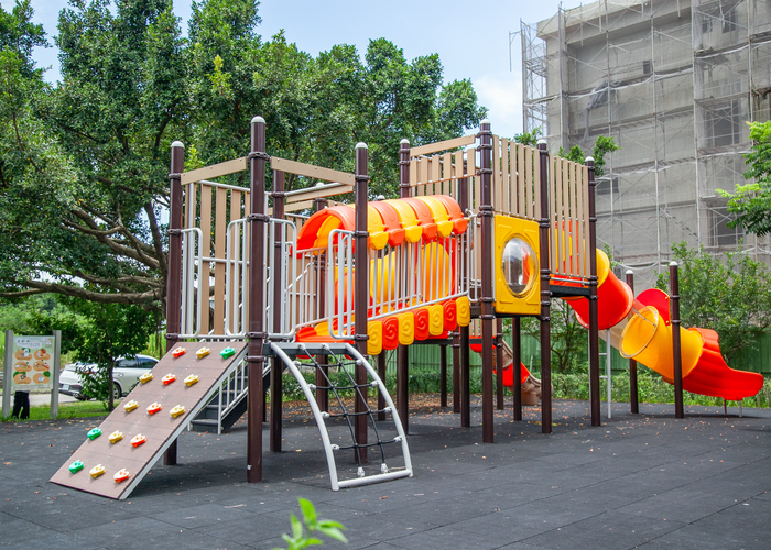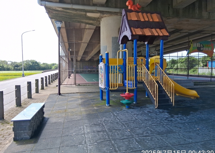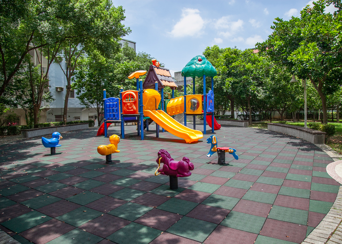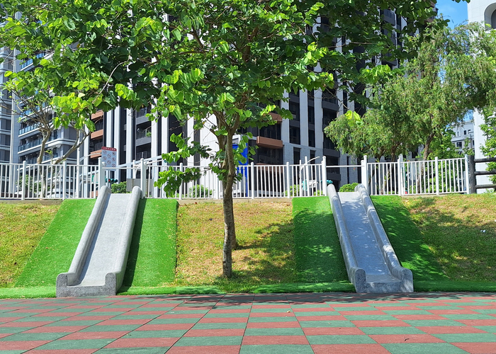 青埔公七公園位於青埔市民活動中心建築上方,巧妙運用建築高低差設置四道不同材質的管狀溜滑梯與攀岩設施,打造層次豐富的立體遊戲空間。園區整體融合自然造景與遊具設計,兼具挑戰性與趣味性,另設有沙坑區,提供更多元的親子互動體驗。