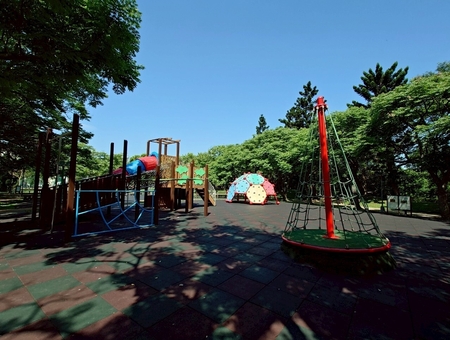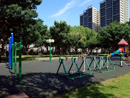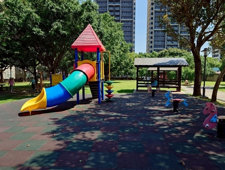 多功能兒童遊戲區:滑梯、爬網、旋轉台應有盡有,安全地墊讓爸媽也能安心看顧。