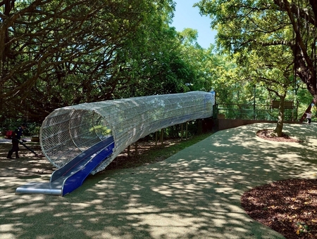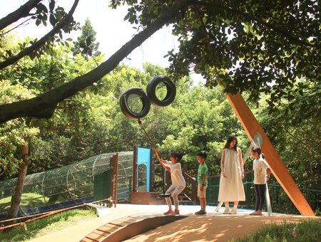 園區以「自然共融、親子共樂」為主題,設計出一座座色彩繽紛的遊戲設施,從木質溜滑梯、攀爬網,到六角造型的探險體驗區,每一角落都充滿童趣與挑戰,是孩子們放電的天堂。視野所及皆是綠蔭與藍天,讓人每一口呼吸都感到放鬆。