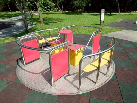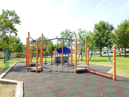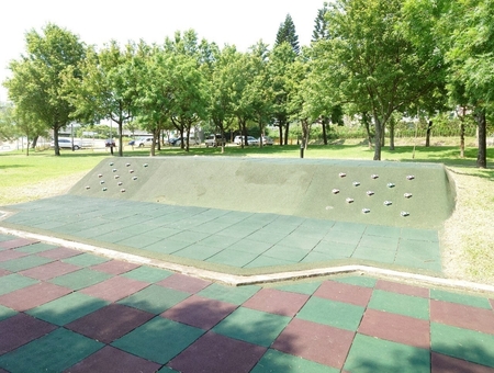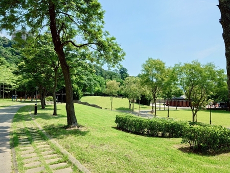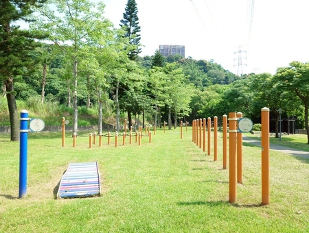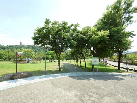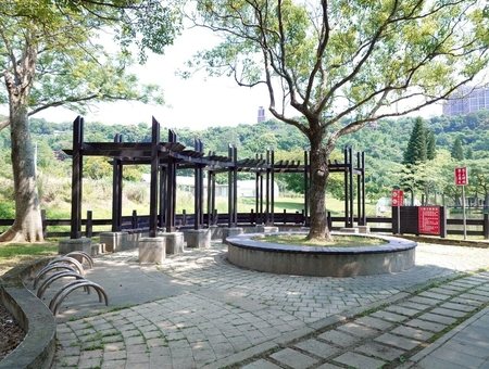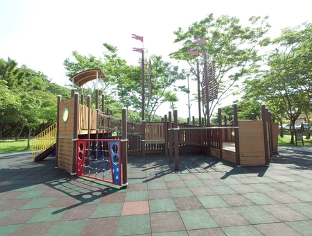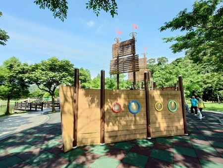 公園內的兒童遊戲場以「自然共融」為設計主軸,設施與地形、植栽巧妙結合,打造一座貼近自然的親子遊樂空間。特色設施包含共融式大型轉盤、昆蟲造型攀爬牆、旋轉滑板與互動彈跳板等,適合3至12歲孩童使用,並考量無障礙需求,讓每位小朋友都能安心參與遊戲。