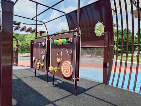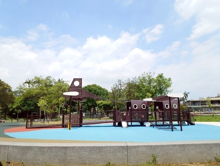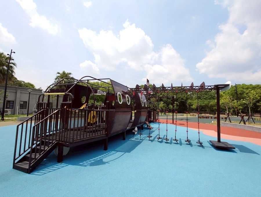 以飛機造型打造的大型主題遊具,設有滑梯、攀爬網與探險艙等模擬傘兵訓練過程,吸引大小朋友體驗軍事挑戰的樂趣。整體設施融合安全設計與體能活動,兼具娛樂與運動功能。