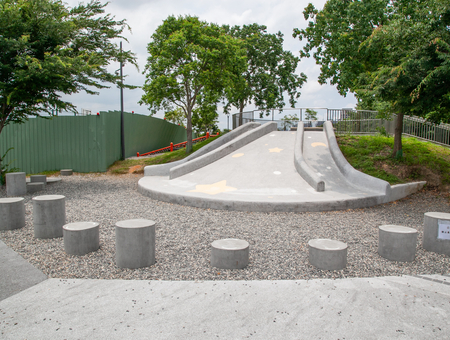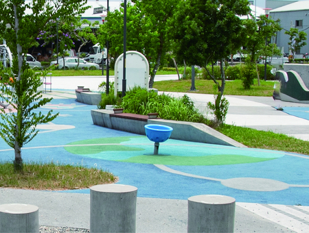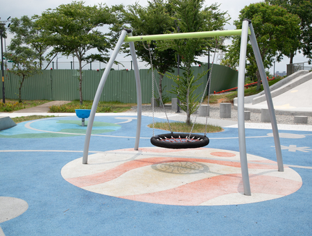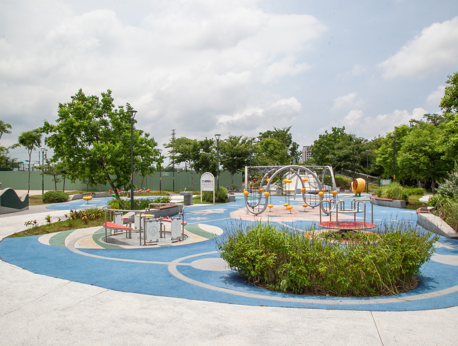 大江內定公園位於大園區大園路二段,鄰近大江購物中心,是一座以星際為主題的遊戲場,擁有多項特色遊具。設施包括適合多位兒童共同使用的行星一號旋轉盤、讓孩子挑戰高度的隕石攀爬架、模擬行星旋轉的地球轉轉杯,以及搖動類設施金星翹翹板、毛毛太空蟲搖搖馬和搖搖太空船。搖搖太空船特別設有雙洞口,既可雙人搖晃,也可單人躺臥,玩法多樣。公園特別考量身心障礙兒童需求,設置低矮且無障礙的行星二號共融旋轉盤和飛行盤鞦韆,兼顧多人共玩與安全性。黑洞繪畫互動牆結合身高測量與創意繪畫空間,激發孩子的想像力與互動樂趣。除上述遊具外,公園旁還設有地景溜滑梯區,利用土丘高度打造刺激滑行體驗,並採用松散鋪面材質,使整體空間更貼近自然。公園色彩繽紛、童趣盎然,讓孩子彷彿化身星際太空人,盡情展開奇幻冒險與探索。