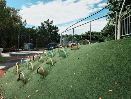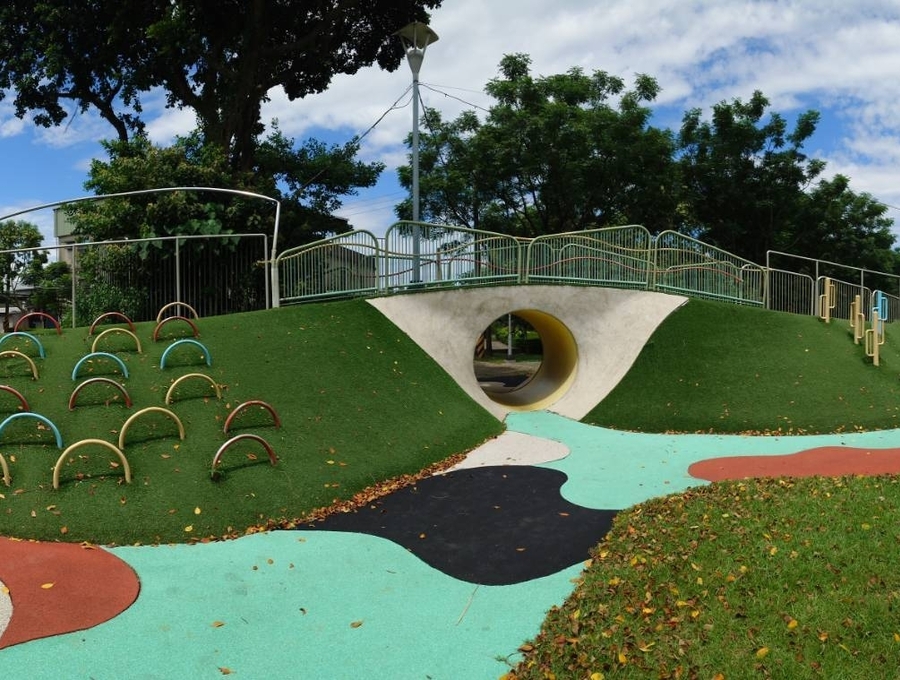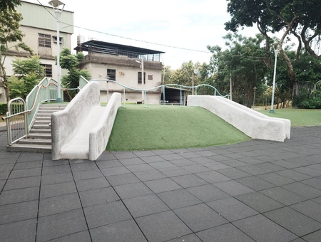 公園設有多達11項遊樂設施,包括磨石子溜滑梯、鳥巢盪鞦韆、人工草皮小山坡、沙坑、攀爬區、兒童旋轉盤等,適合各年齡層兒童遊玩。此外,園區內還設有洗手洗腳檯,方便清潔。