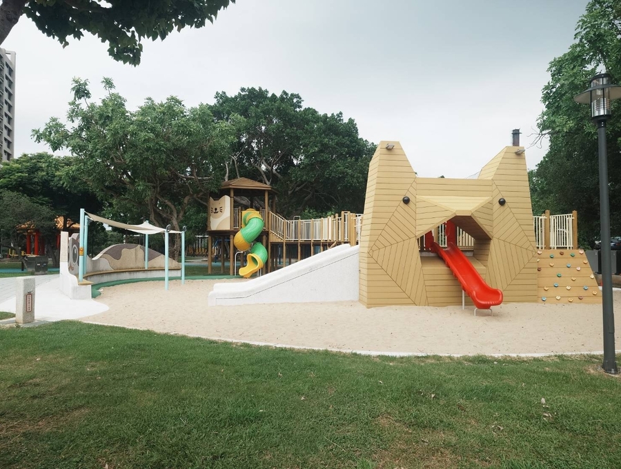 *貓咪樹屋涼亭:設計成貓咪造型的樹屋,提供遮陽休息的空間,也是小朋友的秘密基地。