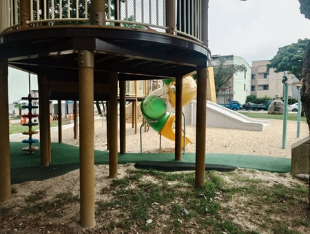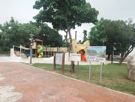 *狗狗造型溜滑梯:一隻吐舌頭的小黃狗造型的滑梯,結合直滑梯、螺旋滑梯、磨石子滑梯、攀岩牆與鑽籠等功能,底部為大沙坑鋪面,讓小朋友在遊玩中增添樂趣。