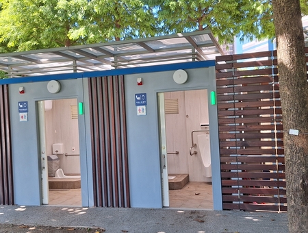 服務完整性,提供完善的遊戲場周邊服務設施(遮蔭休憩設施、廁所、照護設施..)考量基地空間條件,盡可能提供完善的周邊服務設施
