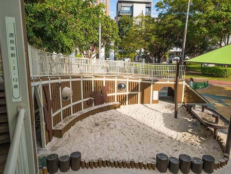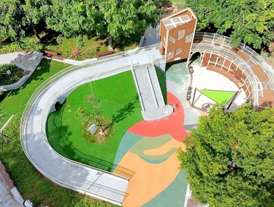 - 秘密樹屋探索區:順應既有地形,減少坡道量體,卻能創造明顯高差,整併既有遊戲場及閒置空間,打造分齡遊戲場域, 林蔭空間塑造秘密小屋,提供鬆散材自由遊戲場域。