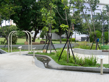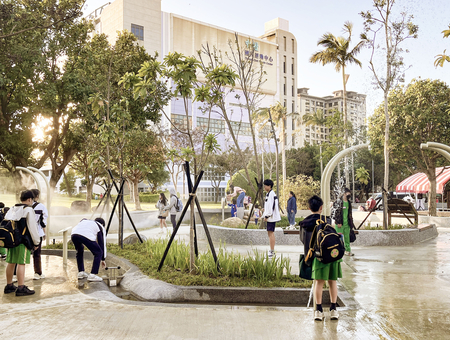 水樹遊戲島:呼應埤塘、老街溪的文史記憶,營造地景式水遊戲區,淺水道結合水機關,創造多元互動的遊戲趣味,利用植栽、石頭等元素,打造自然遊戲氛圍,創造四季皆可玩的水遊戲地景。