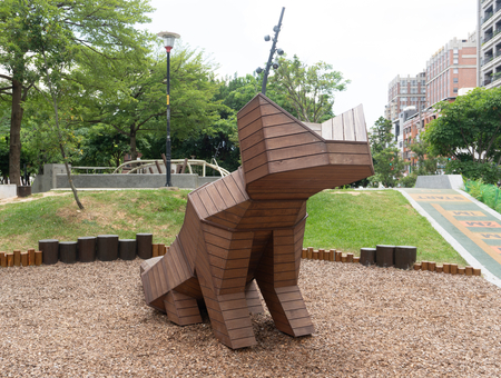 森林冒險挑戰區:鋼構結合網繩,創造攀爬、滑溜、休憩的空間,上層有躺臥的空間,下層則有遮蔭躲避的效果,利用混凝土結構、鋼構、石頭、木材等堆疊及擺放,創造跑跳挑戰路徑,入口攀木蜥蜴木雕,成為遊戲場的入口意象,歡迎大家的到來。