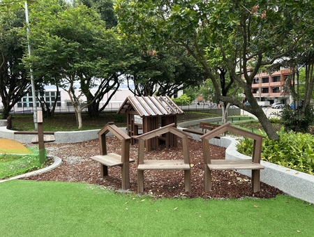 秘密樹屋探索區:順應既有地形,減少坡道量體,卻能創造明顯高差,整併既有遊戲場及閒置空間,打造分齡遊戲場域, 林蔭空間塑造秘密小屋,提供鬆散材自由遊戲場域。