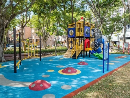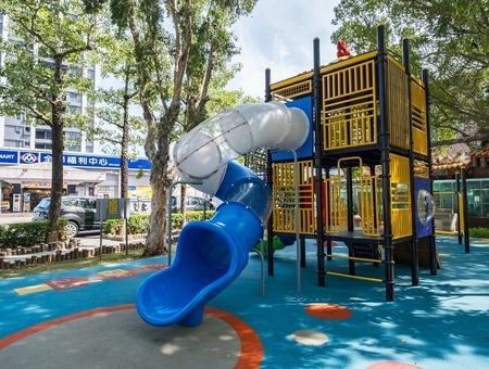 遊戲場以活潑可愛的黃色小雞為核心意象,打造出一座造型鮮明的雙層遊戲塔,充分激發孩子的好奇心與探索慾。組合遊具也結合滑梯、攀爬網、觀景平台等多項設施,營造富有趣味與冒險感的遊戲空間,吸引孩童探索與互動。