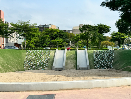 共融式遊戲區:設有環形遊戲場,包含大片沙坑、磨石子溜滑梯與攀爬坡,適合2至5歲兒童遊玩,提升孩子的體能與協調性。