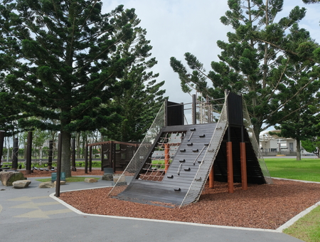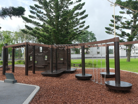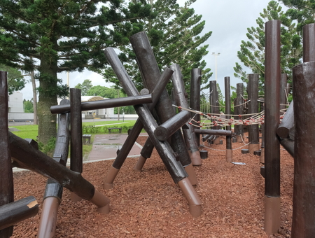 位於桃園市龍潭區陸軍司令部前方的「綠杉林公園」不只是周邊居民休憩的好地方,其中親子遊戲場特別設置兒童體能設施,結合陸軍特色500障礙賽闖關精神,設定六大區關卡及多達15種以上遊戲設施,讓小朋友們訓練體能、體驗冒險,為結合體能訓練與親子遊憩的公共空間。