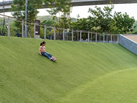 為了提供更友善的陪伴環境,公園內貼心設置了休憩涼亭、舒適座椅以及避暑遮蔭設施,讓家長在孩子挑戰自我時,能有放鬆小憩的角落。挑戰區旁更規畫了多功能草坪空間,非常適合進行小型球類活動或溫馨的野餐時光,整體規劃兼顧了遊戲趣味性與公共舒適度。
