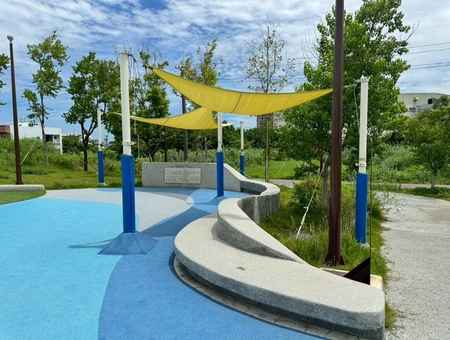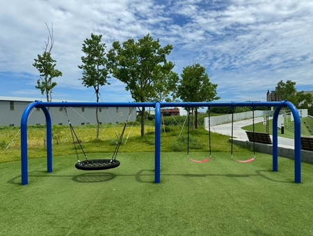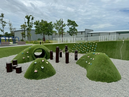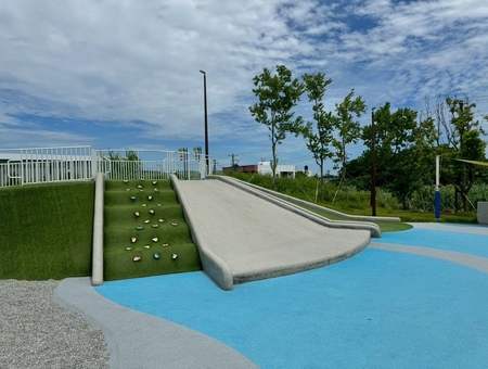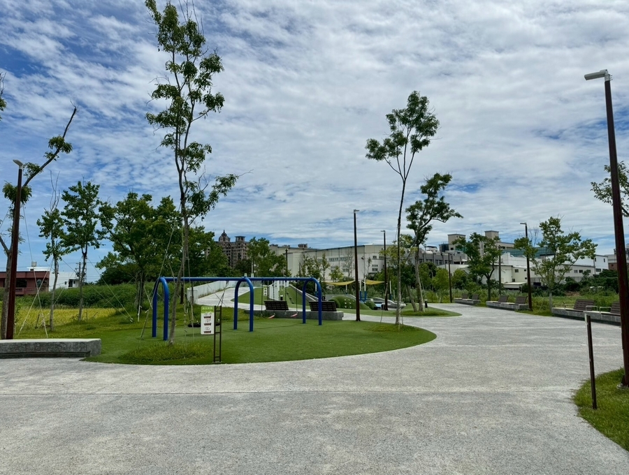 新龍公園位於桃園市蘆竹區,是一座以「埤塘」為設計概念的共融式遊戲場。整體空間運用高低起伏的地形,結合草地土丘、滑梯、繩索橋與攀岩牆,提供孩童豐富的體能挑戰與冒險體驗。公園內最受歡迎的是扇形磨石子滑梯與滑草坡,孩子可選擇用滑草板或直接滑下,充滿樂趣。鞦韆區設有共融式鳥巢鞦韆與一般鞦韆,適合不同年齡層使用。