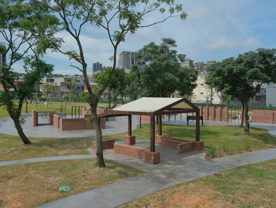 全區採分齡分區規劃,主要分成銀髮樂活區、2~5歲遊戲區、5~12歲遊戲區及適宜13歲以上的活動區域。銀髮樂活區汰換原老舊設施、拆除原有組合式遊具,更新體健設施、地坪、座椅及植栽等,維持社交空間機能,整合為適合全齡使用的休憩廣場。2~5歲和5~12歲遊戲區則擷取眷村冒險、挑戰、勇敢精神,復刻楊梅區四維國小兩條龍精神地標,打造新的覆網爬籠遊戲區。13歲以上活動區域利用紅磚元素還原當時眷村空間分佈情形,提供追憶舊眷村樣貌的空間,也讓孩童在追逐、玩樂中,逐步認識自己家鄉的空間紋理。整座公園特別保留既有楓香林,以步道串聯自然遊戲場,提供孩童在林蔭空間穿梭,搭配園圃誘花誘鳥、賞花賞果植栽,讓孩子能與大自然為友。