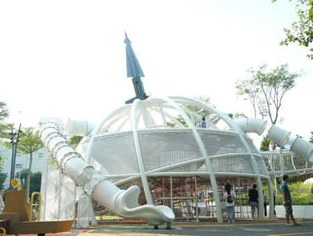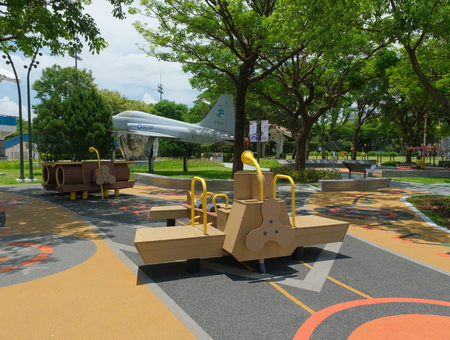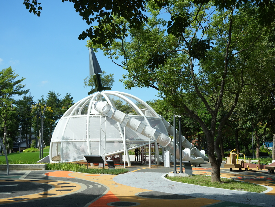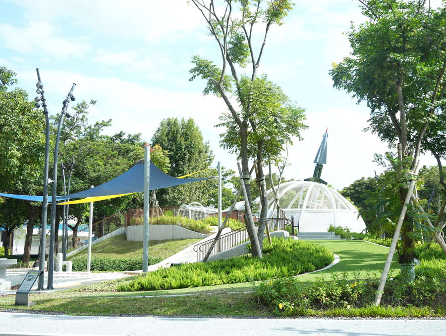 公園的核心亮點為全新打造的軍事主題遊戲場,共分為五大遊戲區,包括「小勇士訓練區」、「軍事設施挑戰區」、「菁英體能探索區」、「共融旋轉歡樂區」及「多元體適能設施區」。其中,最吸睛的設施是象徵空軍勝利女神飛彈的純白大型攀爬設施,結合擺球、繩網與三層滑梯,成為拍照打卡熱點,也讓孩子們在遊戲中鍛鍊身體與勇氣。